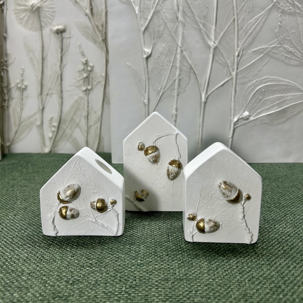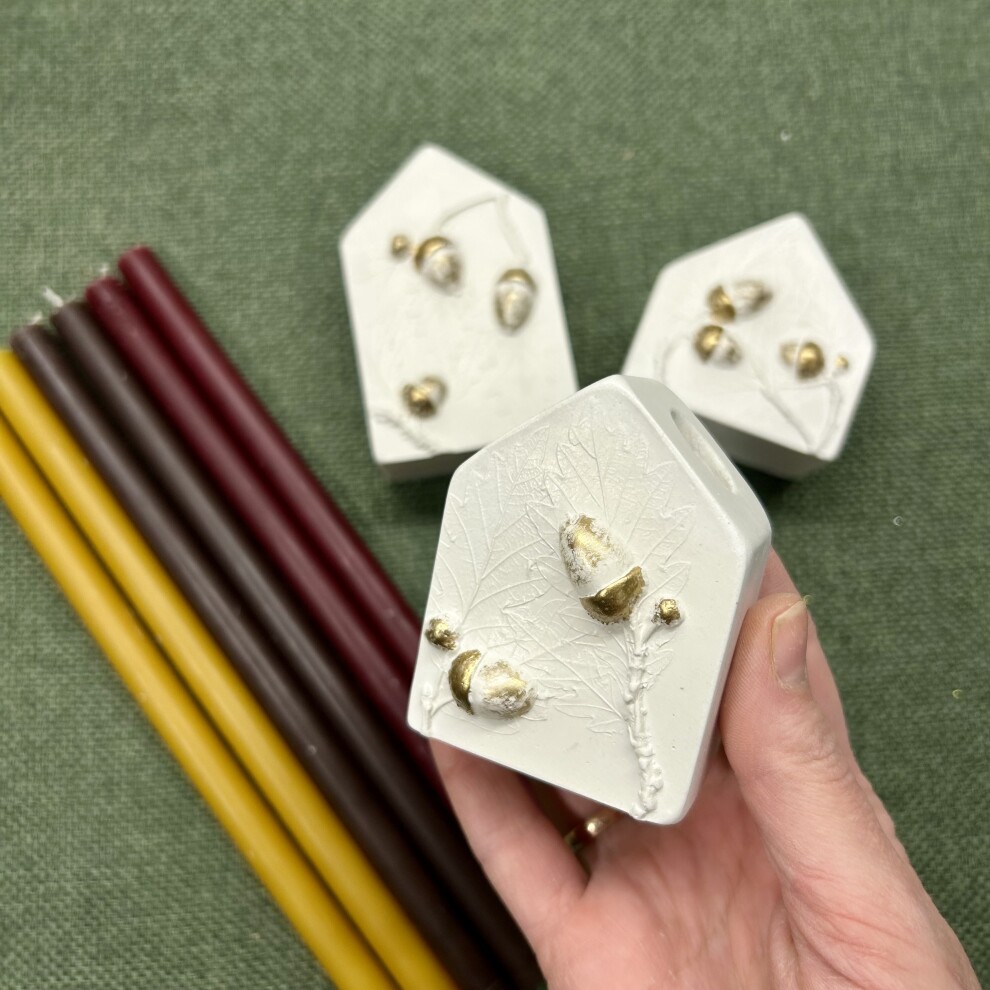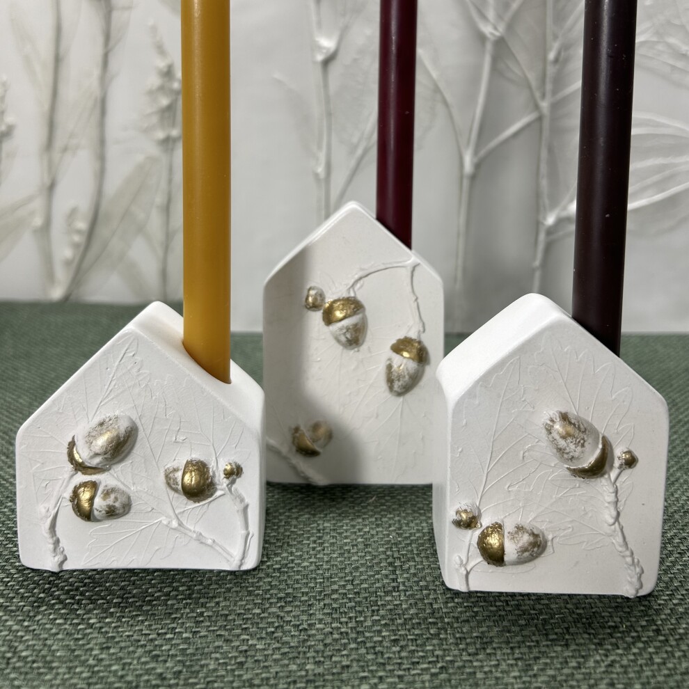 Подсвечники выполнены из высокопрочного гипса и покрыты матовым прозрачным лаком. С одной стороны ботанический барельеф, с другой - гладкая поверхность.