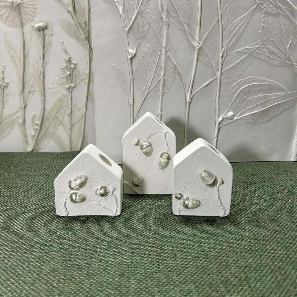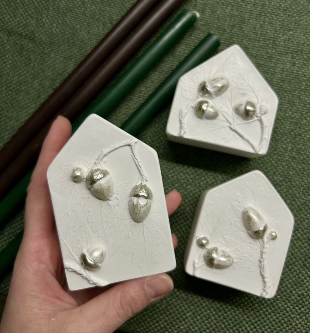 Подсвечники выполнены из высокопрочного гипса и покрыты матовым прозрачным лаком. С одной стороны ботанический барельеф, с другой - гладкая поверхность.