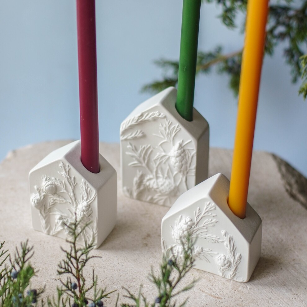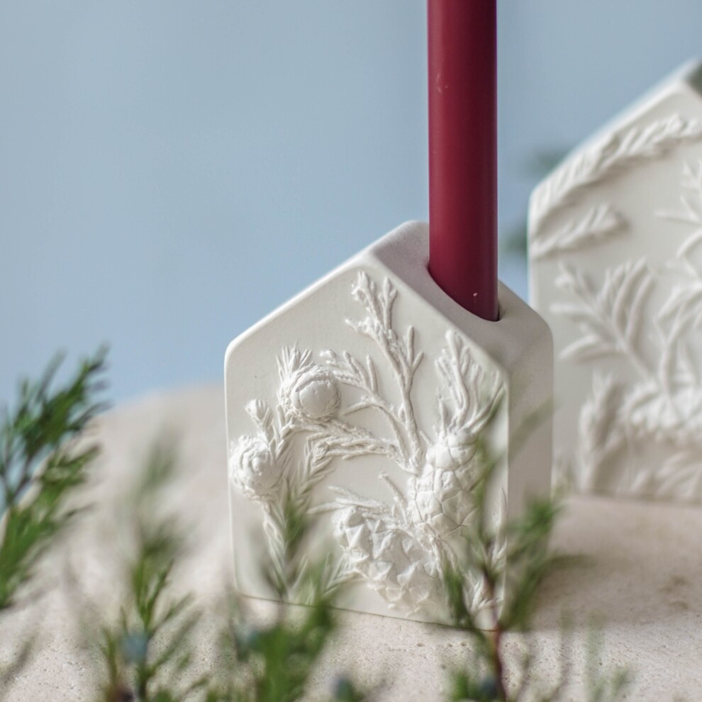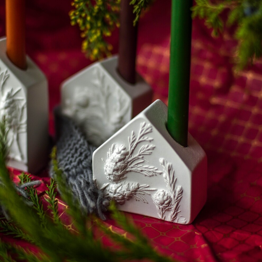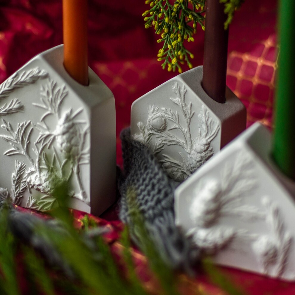 Подсвечники выполнены из высокопрочного гипса и покрыты матовым прозрачным лаком. С одной стороны ботанический барельеф, с другой - гладкая поверхность.
