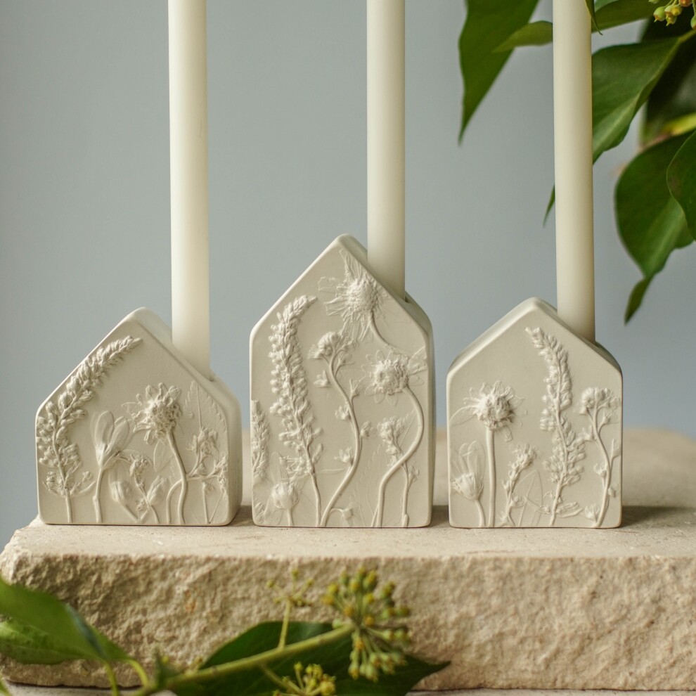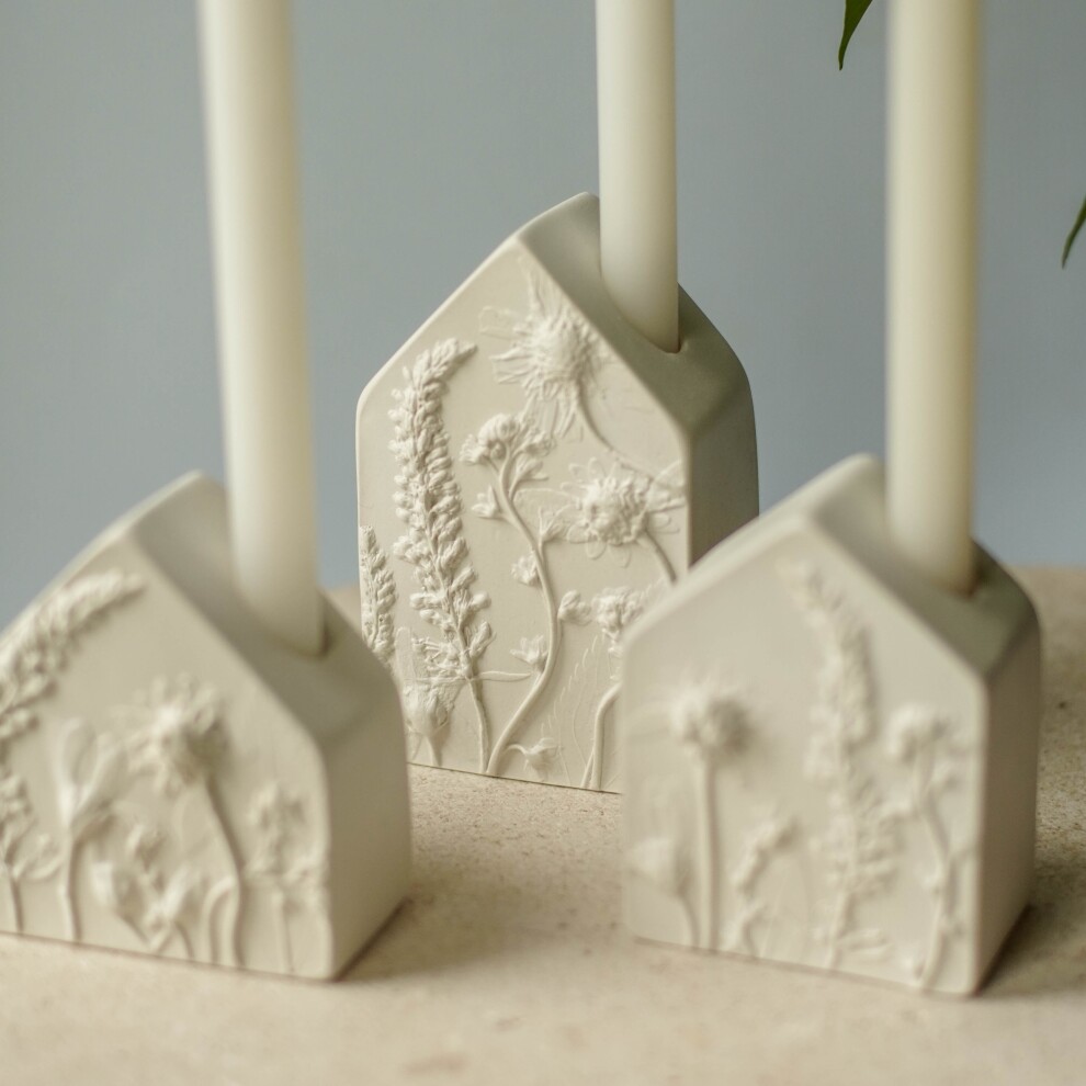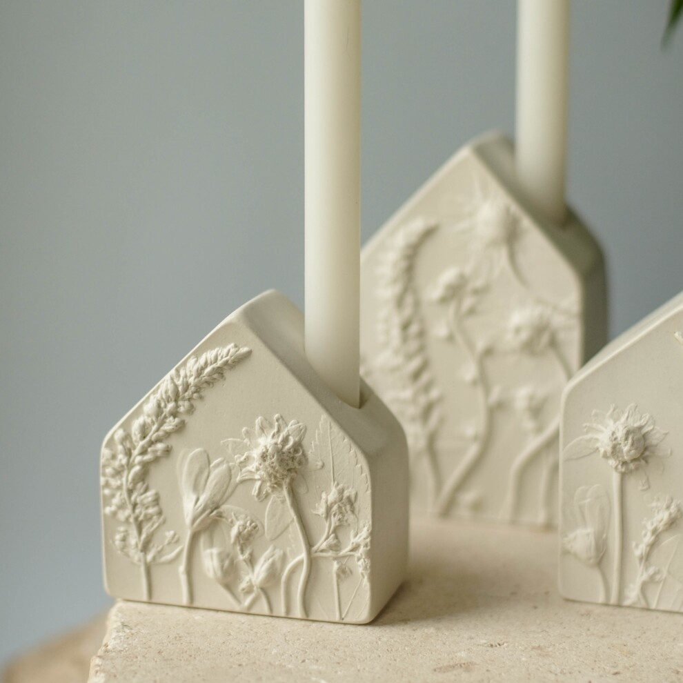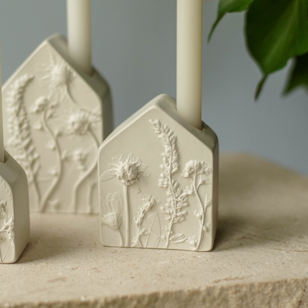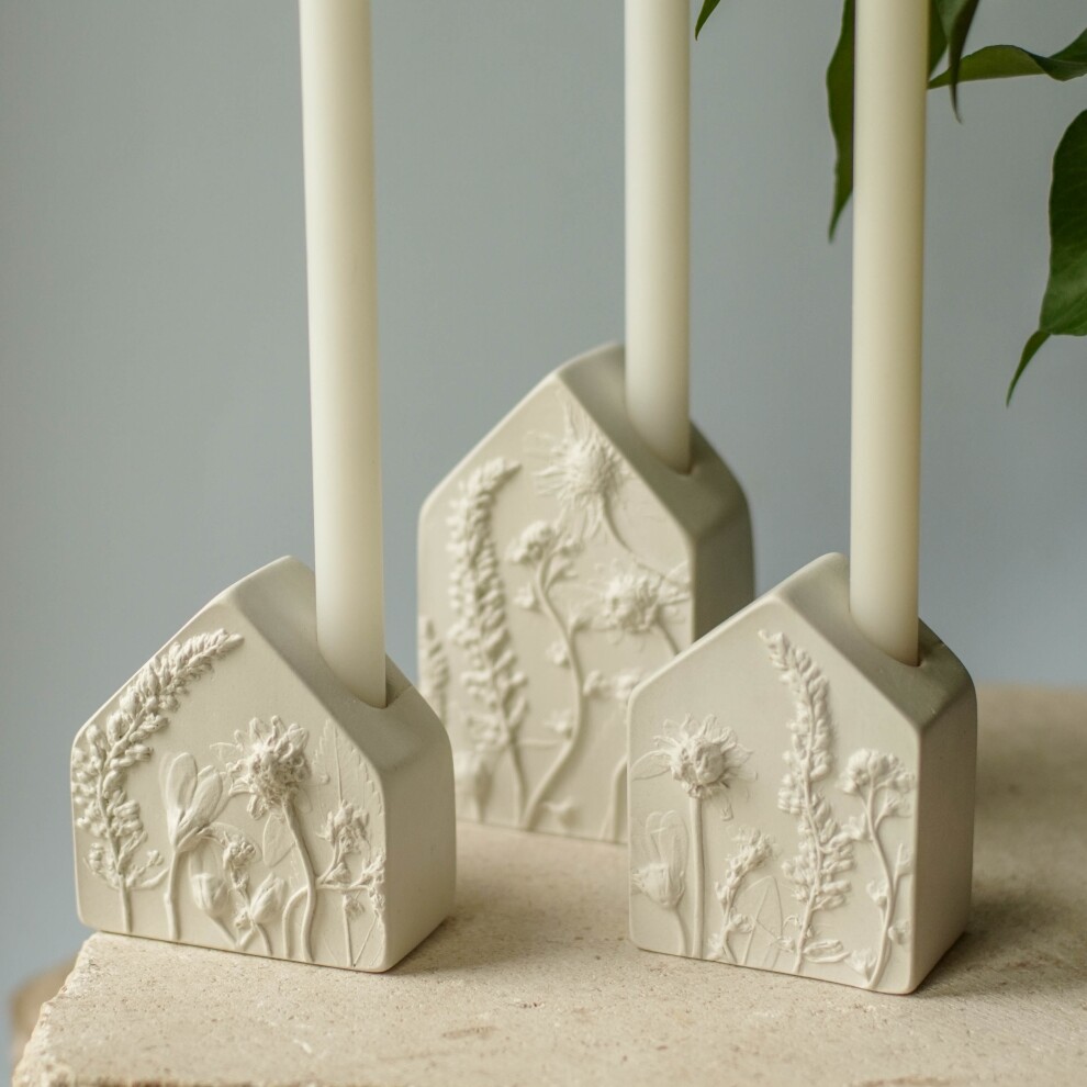 Подсвечники выполнены из высокопрочного гипса и покрыты матовым прозрачным лаком. С одной стороны ботанический барельеф, с другой - гладкая поверхность.