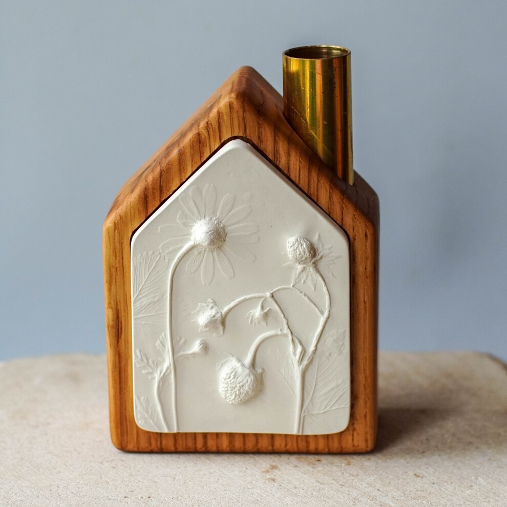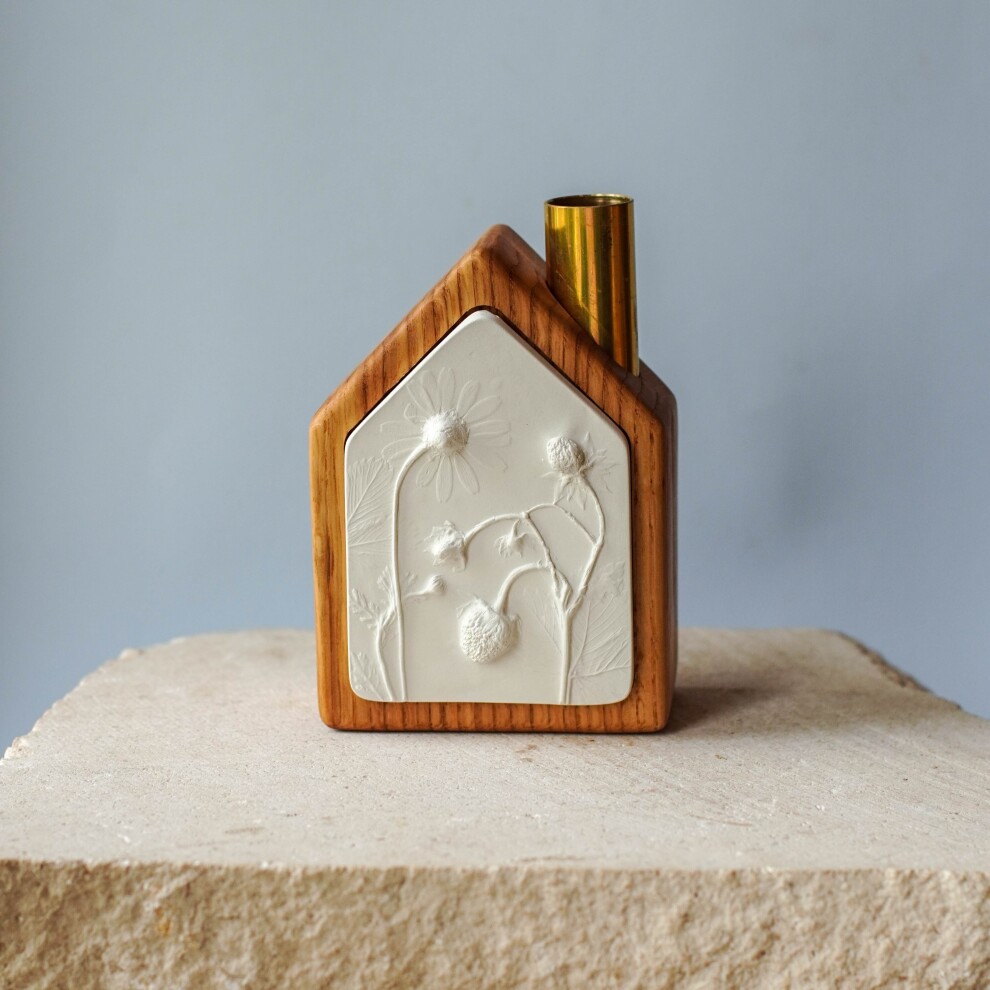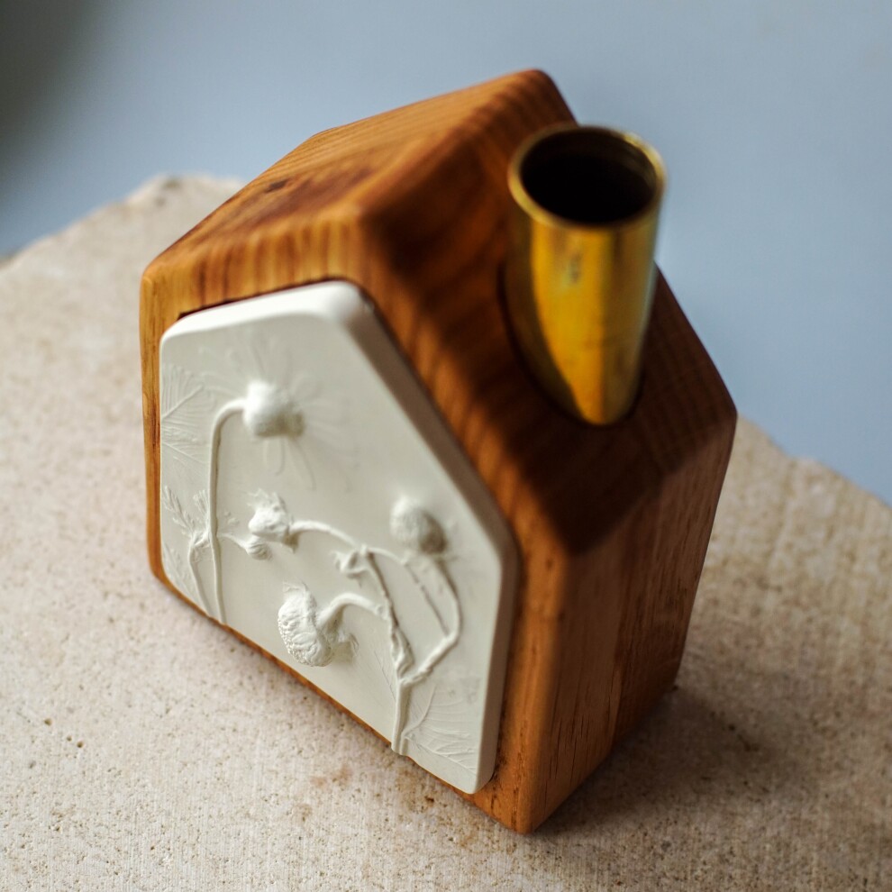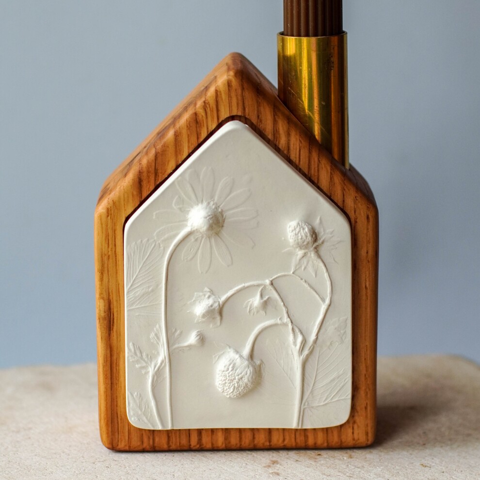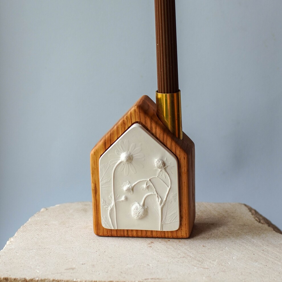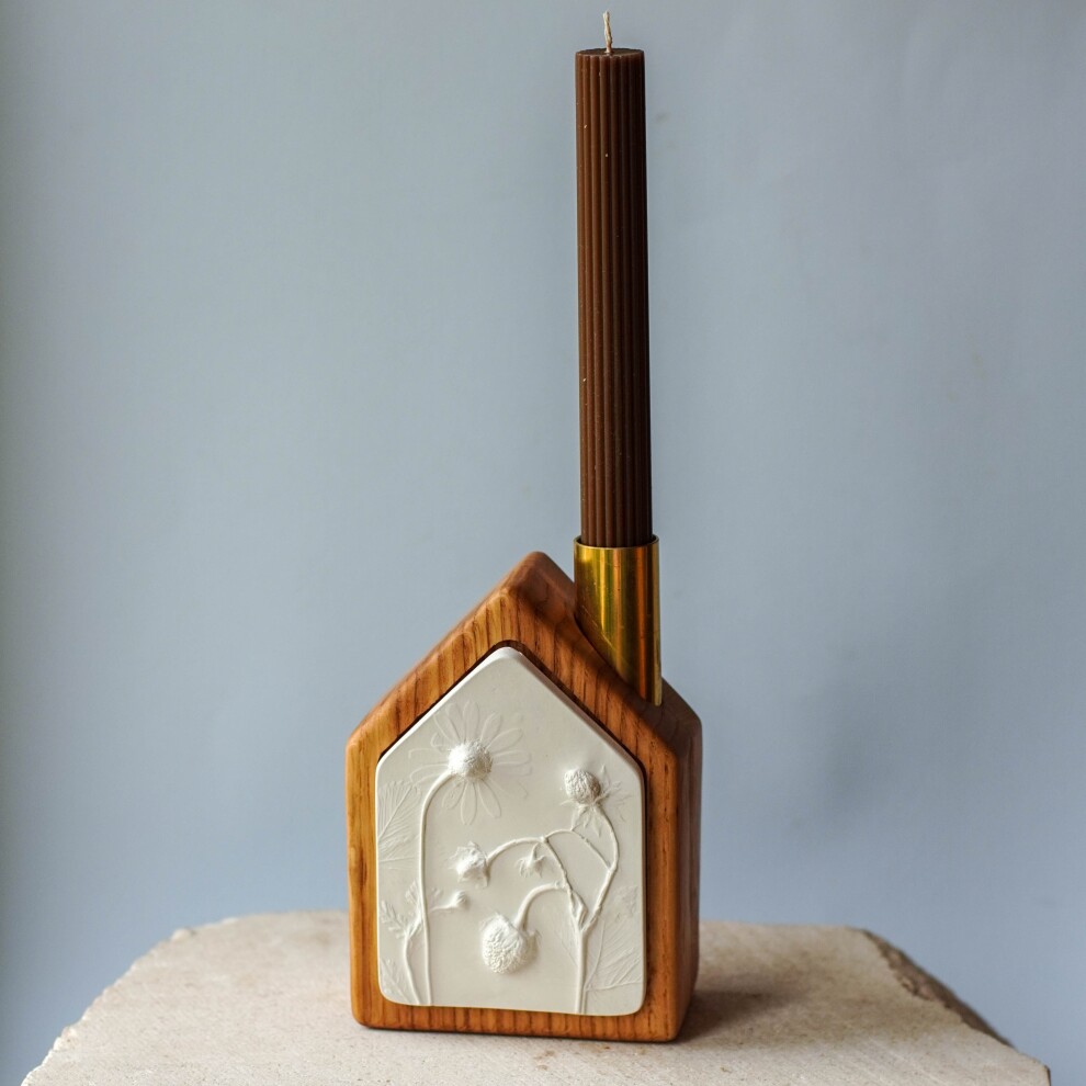 Дубовый подсвечник с ботаническим барельефом с ромашками и клубникой.
