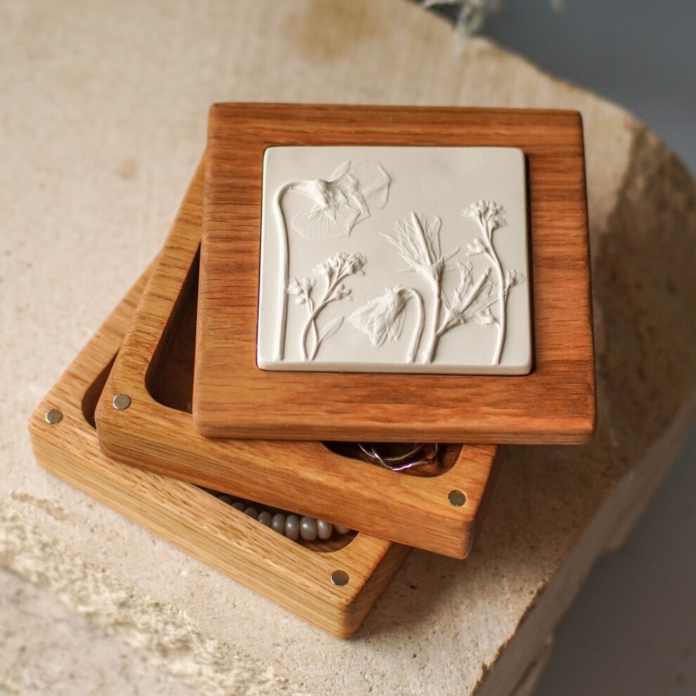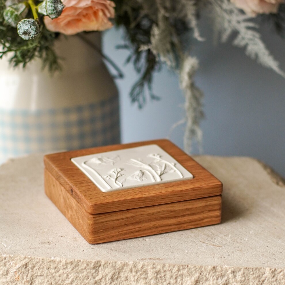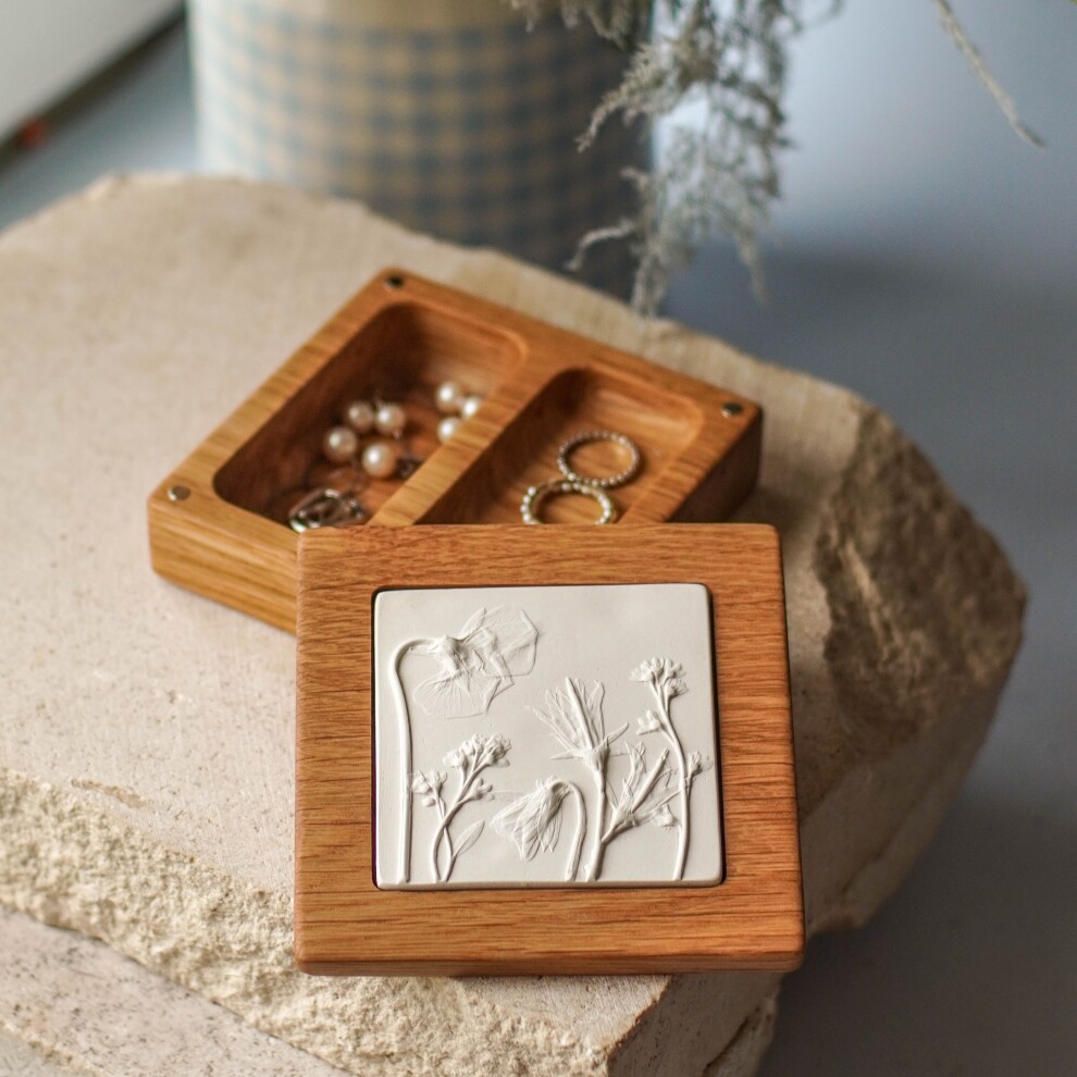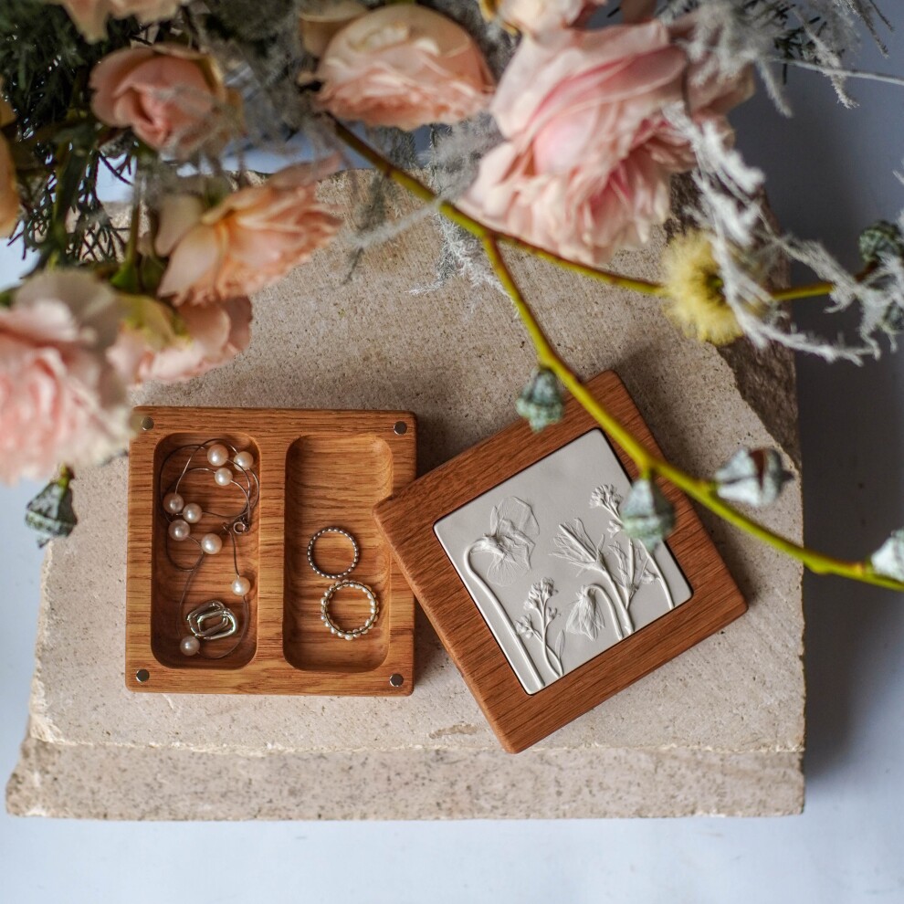 Шкатулка для украшений выполнена из массива дуба, дерево покрыто маслом. Цвет и узор дерева могут отличаться от представленных на фото. Барельеф - гипсовый оттиск натуральных растений.