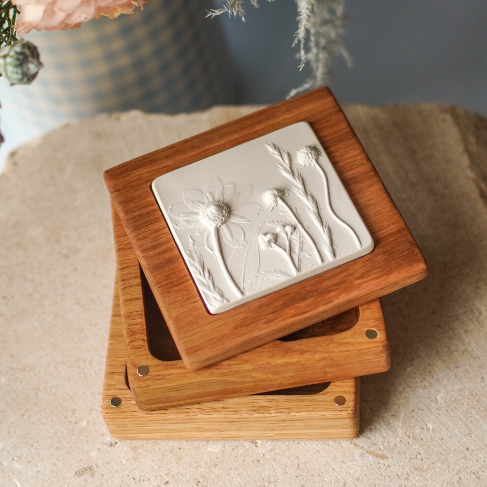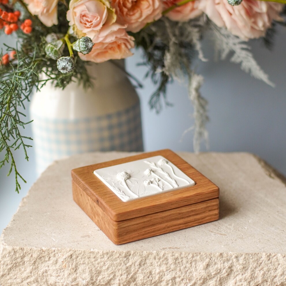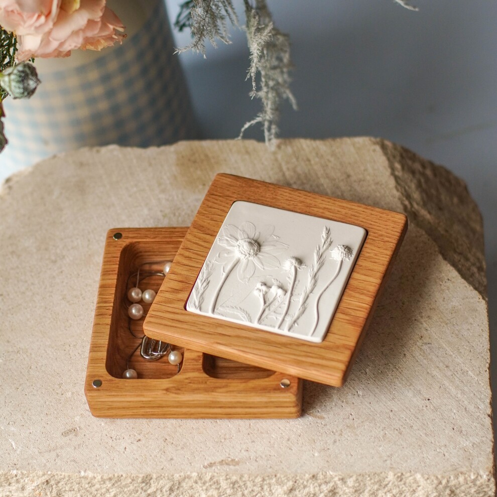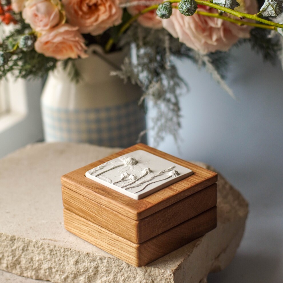 Шкатулка для украшений выполнена из массива дуба, дерево покрыто маслом. Цвет и узор дерева могут отличаться от представленных на фото. Барельеф - гипсовый оттиск натуральных растений.