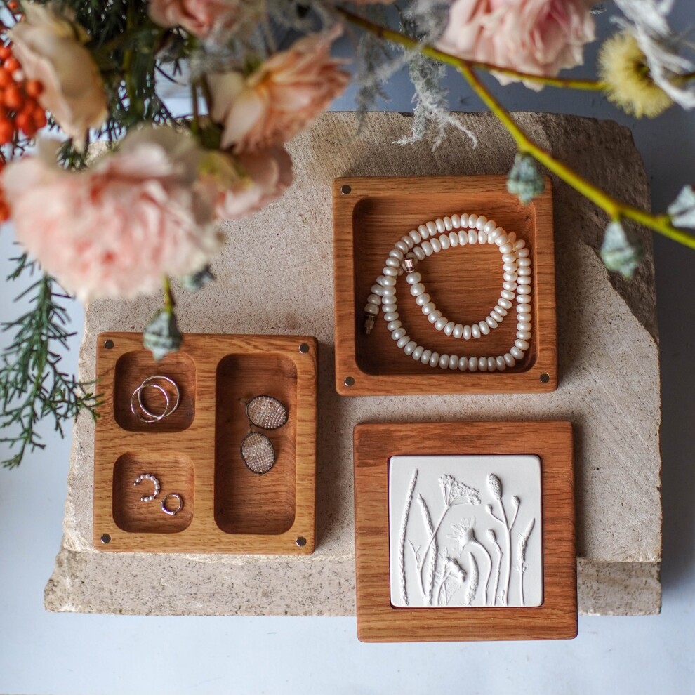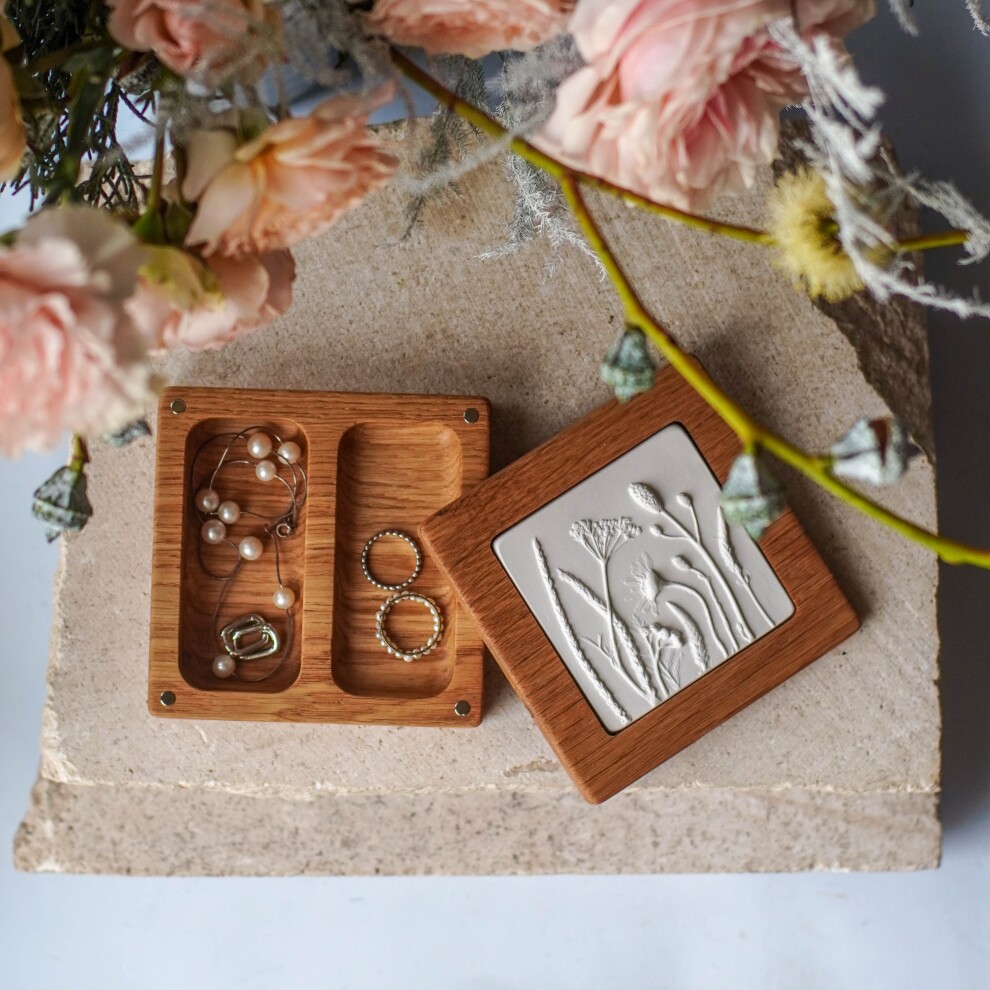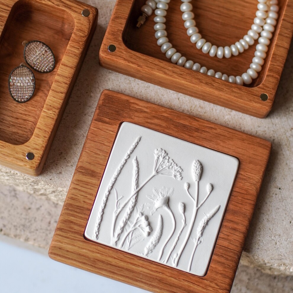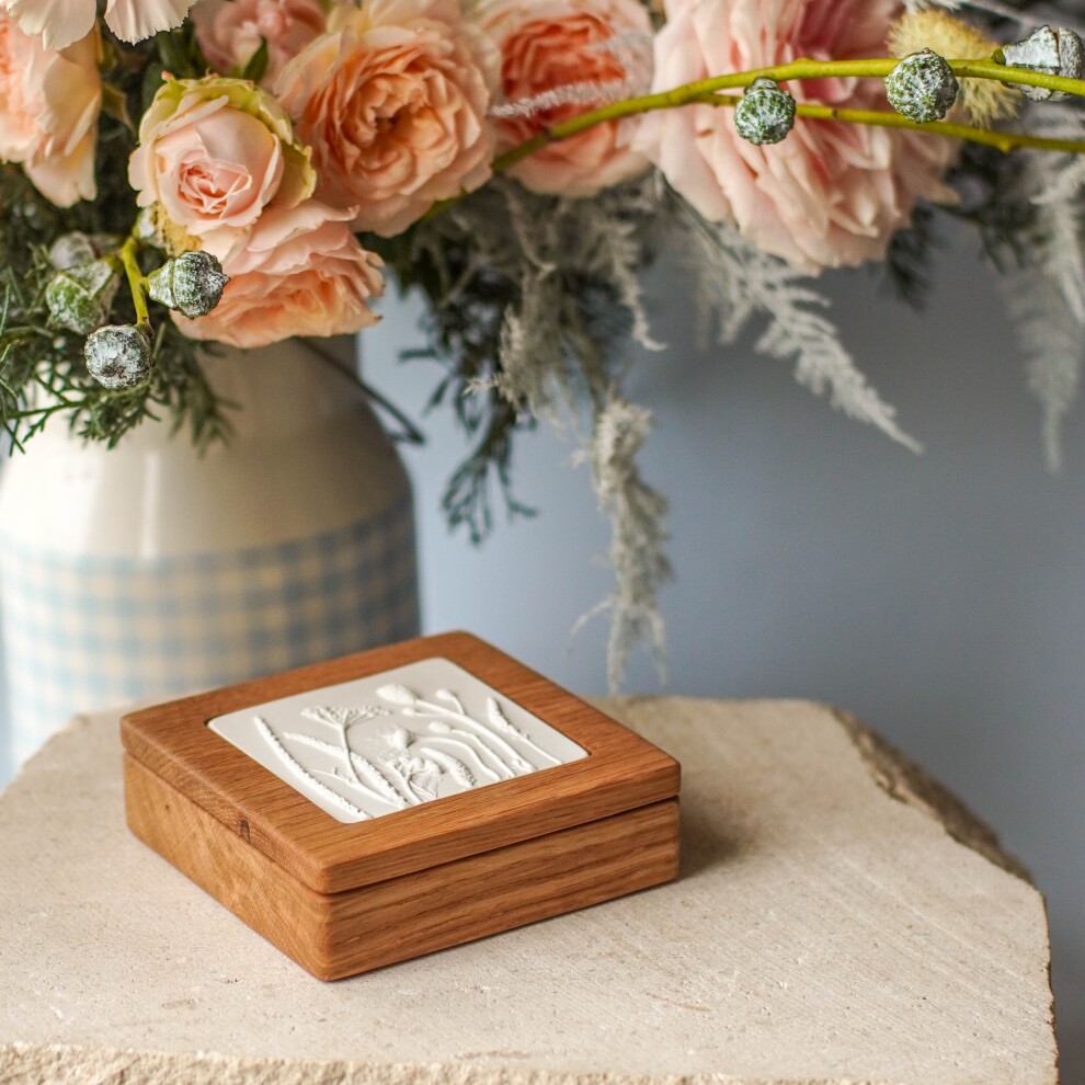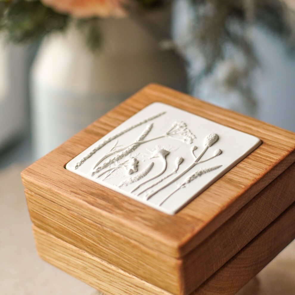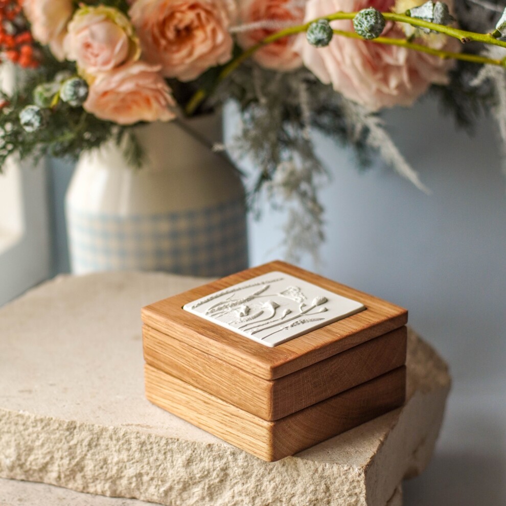 Шкатулка для украшений выполнена из массива дуба, дерево покрыто маслом. Цвет и узор дерева могут отличаться от представленных на фото. Барельеф - гипсовый оттиск натуральных растений.