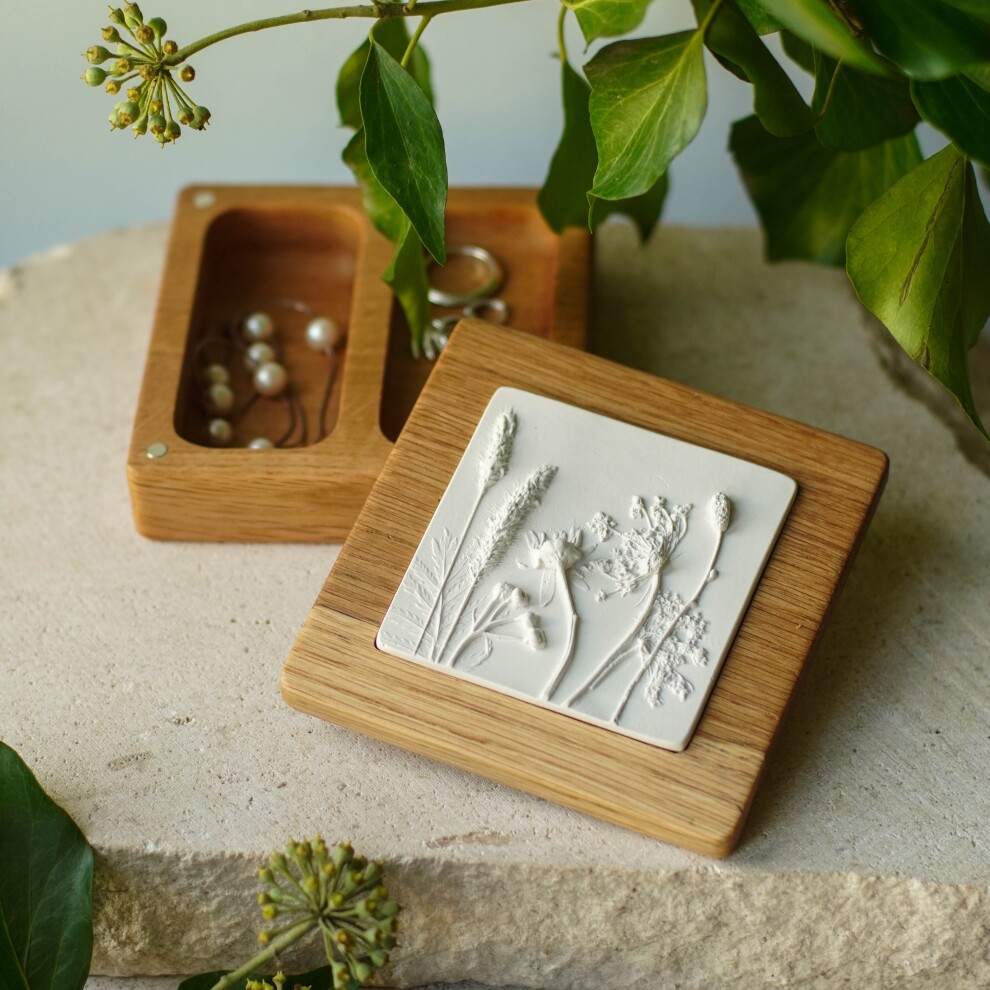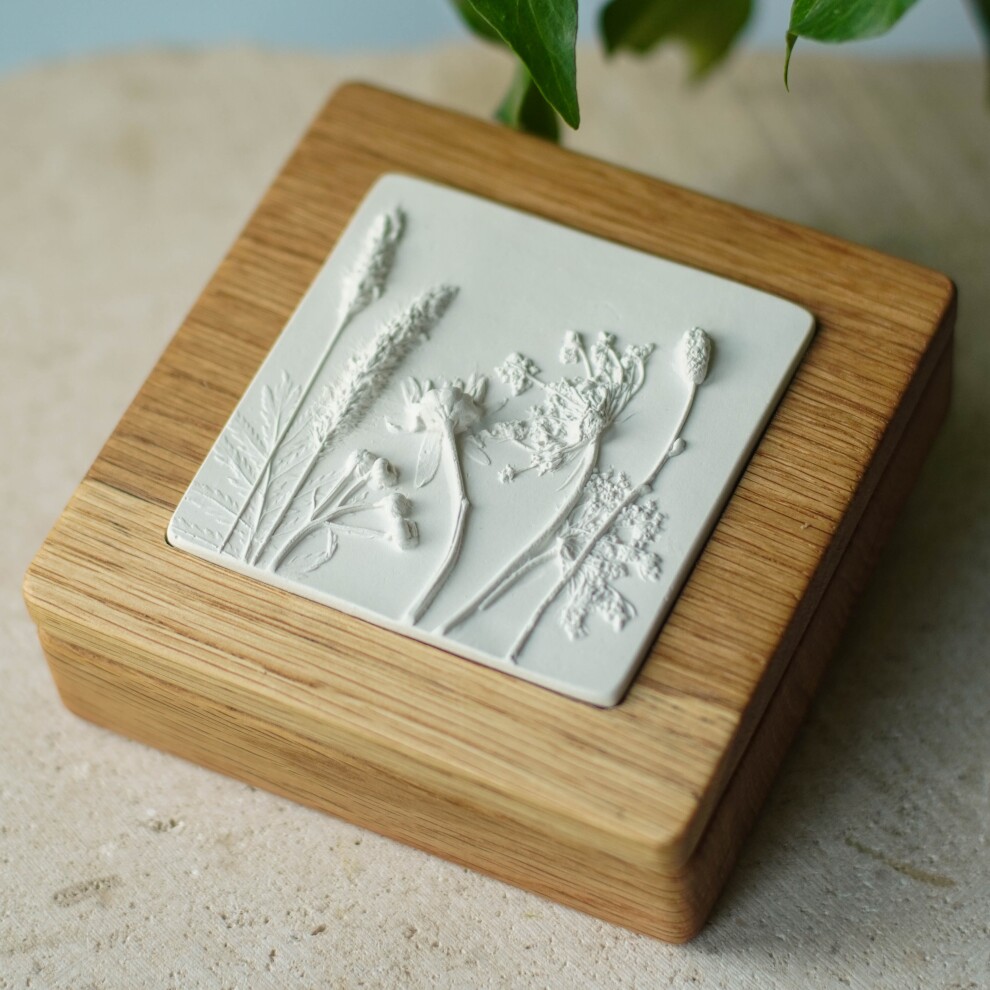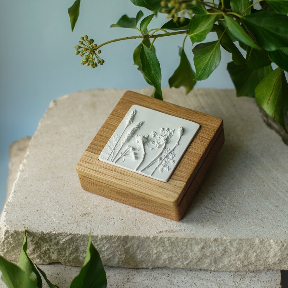 Шкатулка для украшений выполнена из массива дуба, дерево покрыто маслом. Цвет и узор дерева могут отличаться от представленных на фото. Барельеф - гипсовый оттиск натуральных растений.