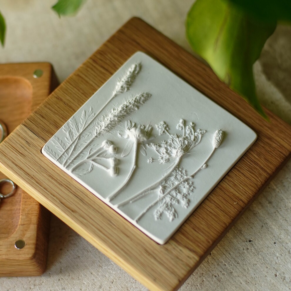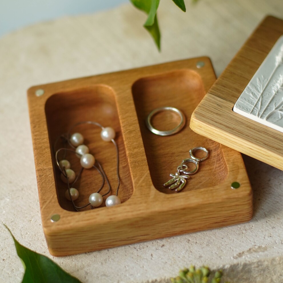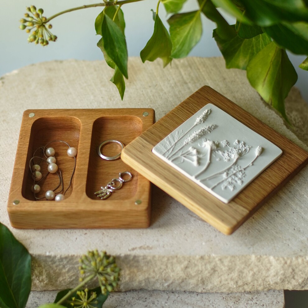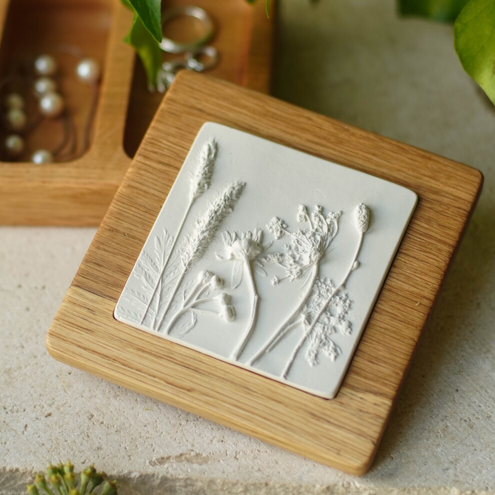Шкатулка для украшений выполнена из массива дуба, дерево покрыто маслом. Цвет и узор дерева могут отличаться от представленных на фото. Барельеф - гипсовый оттиск натуральных растений.