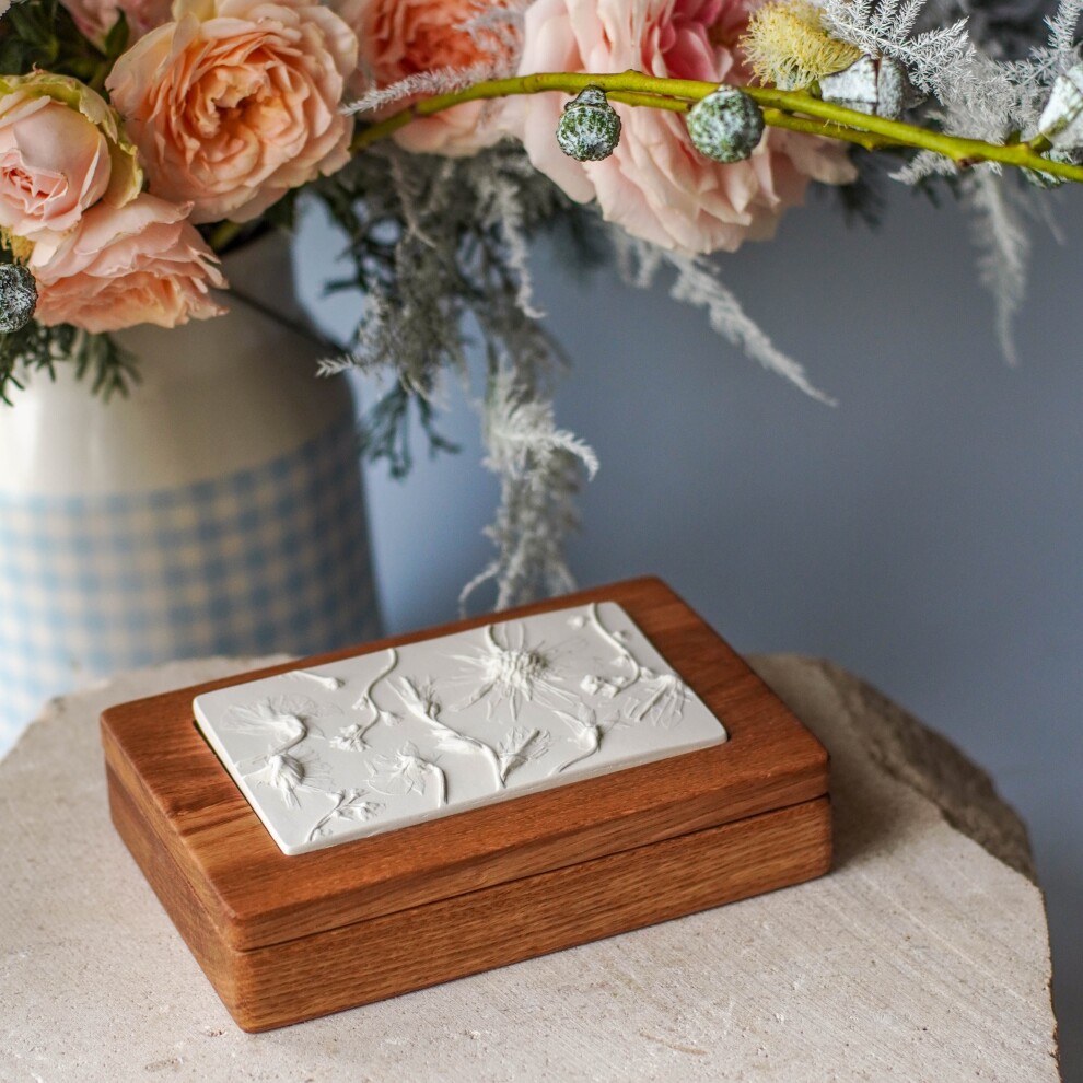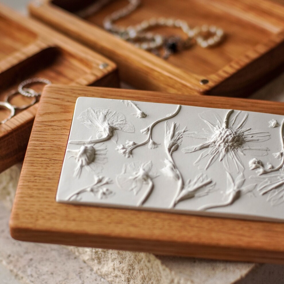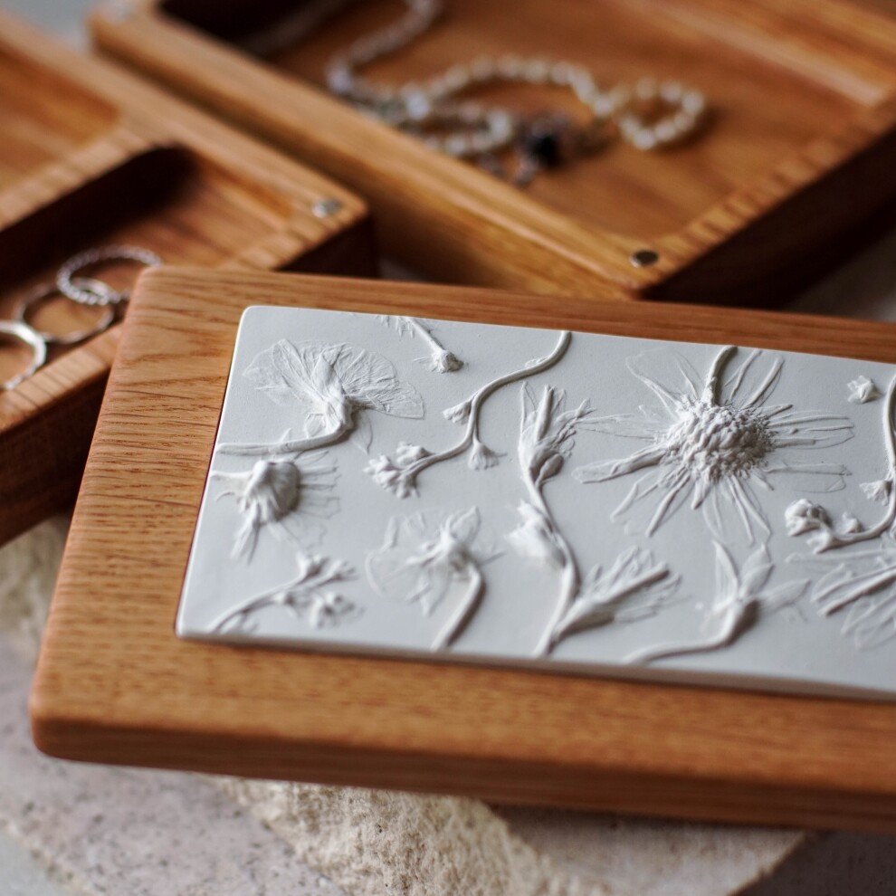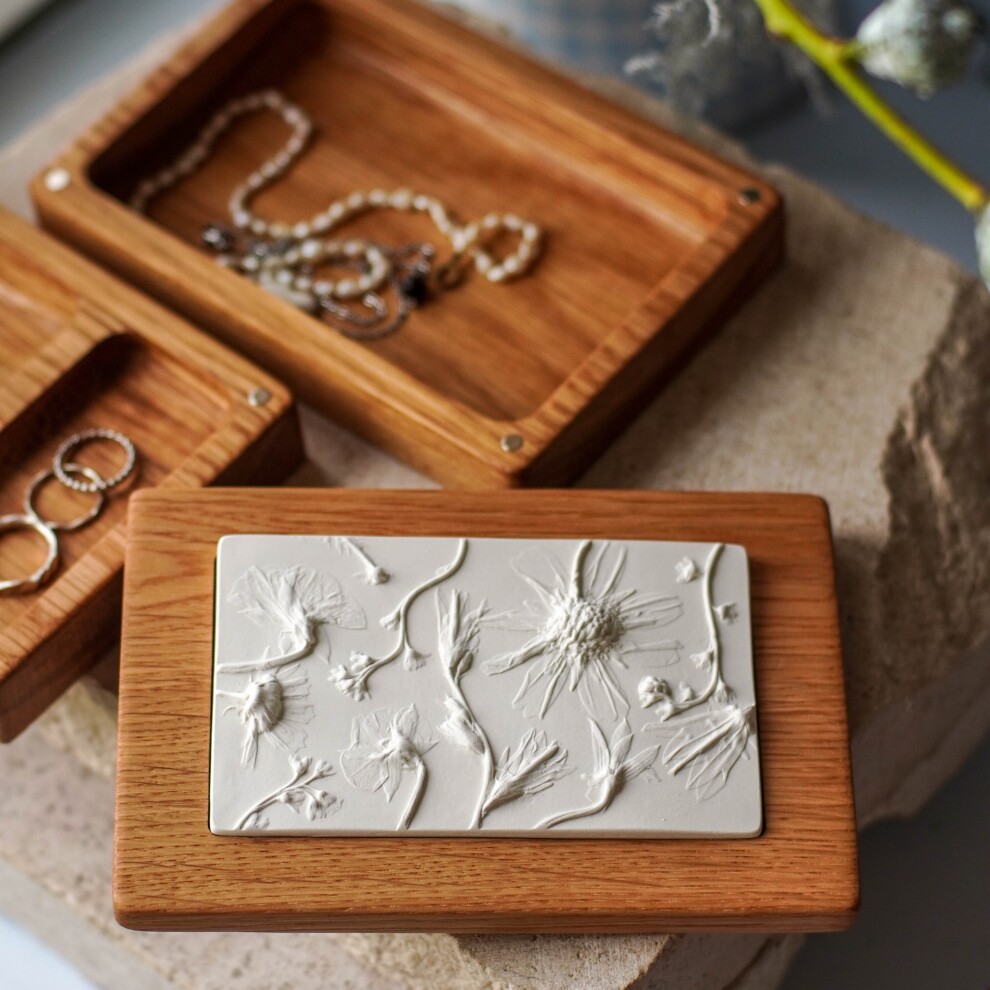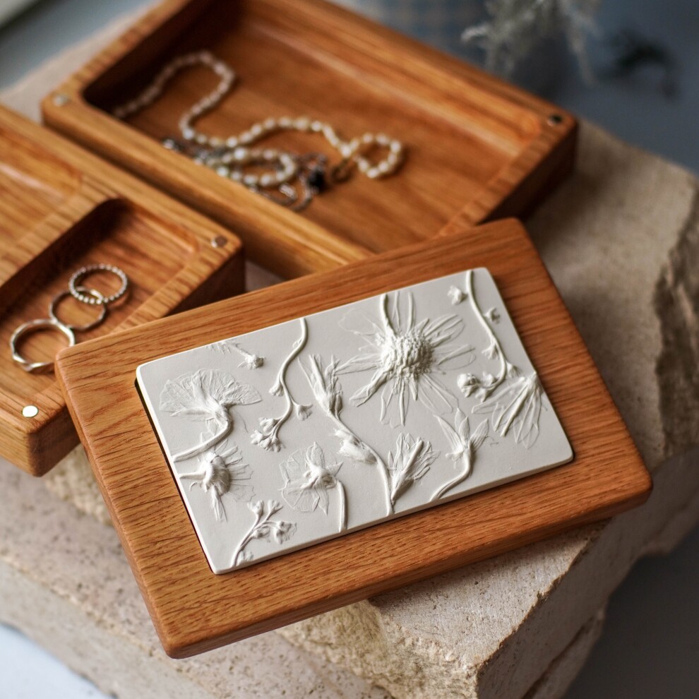 Шкатулка для украшений выполнена из массива дуба, дерево покрыто маслом. Цвет и узор дерева могут отличаться от представленных на фото. Барельеф - гипсовый оттиск натуральных растений.