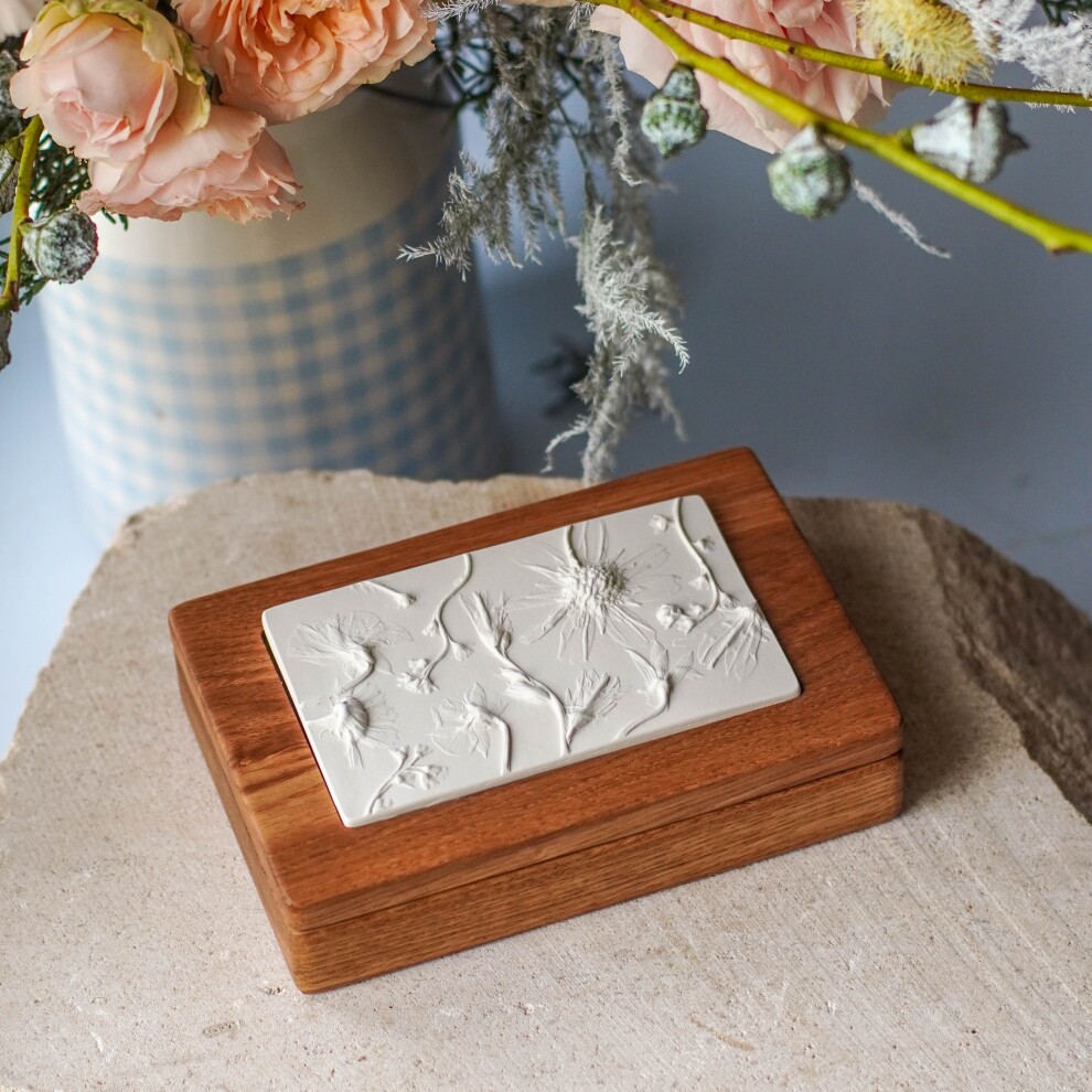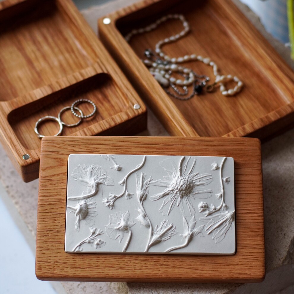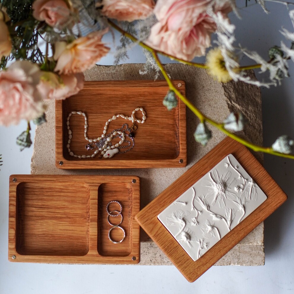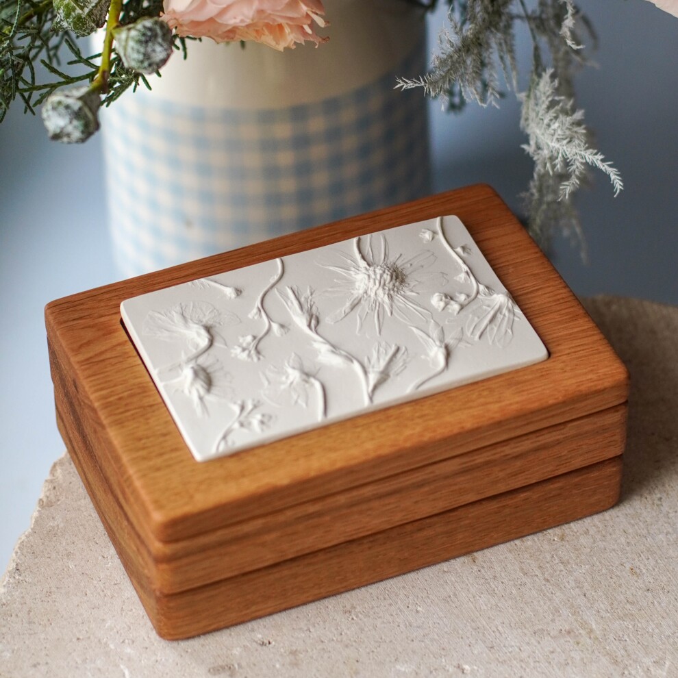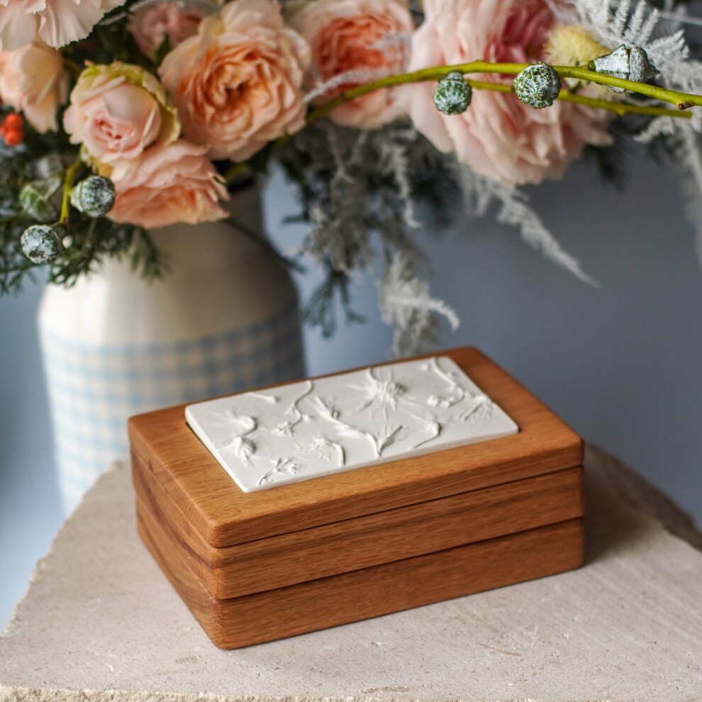 Шкатулка для украшений выполнена из массива дуба, дерево покрыто маслом. Цвет и узор дерева могут отличаться от представленных на фото. Барельеф - гипсовый оттиск натуральных растений.