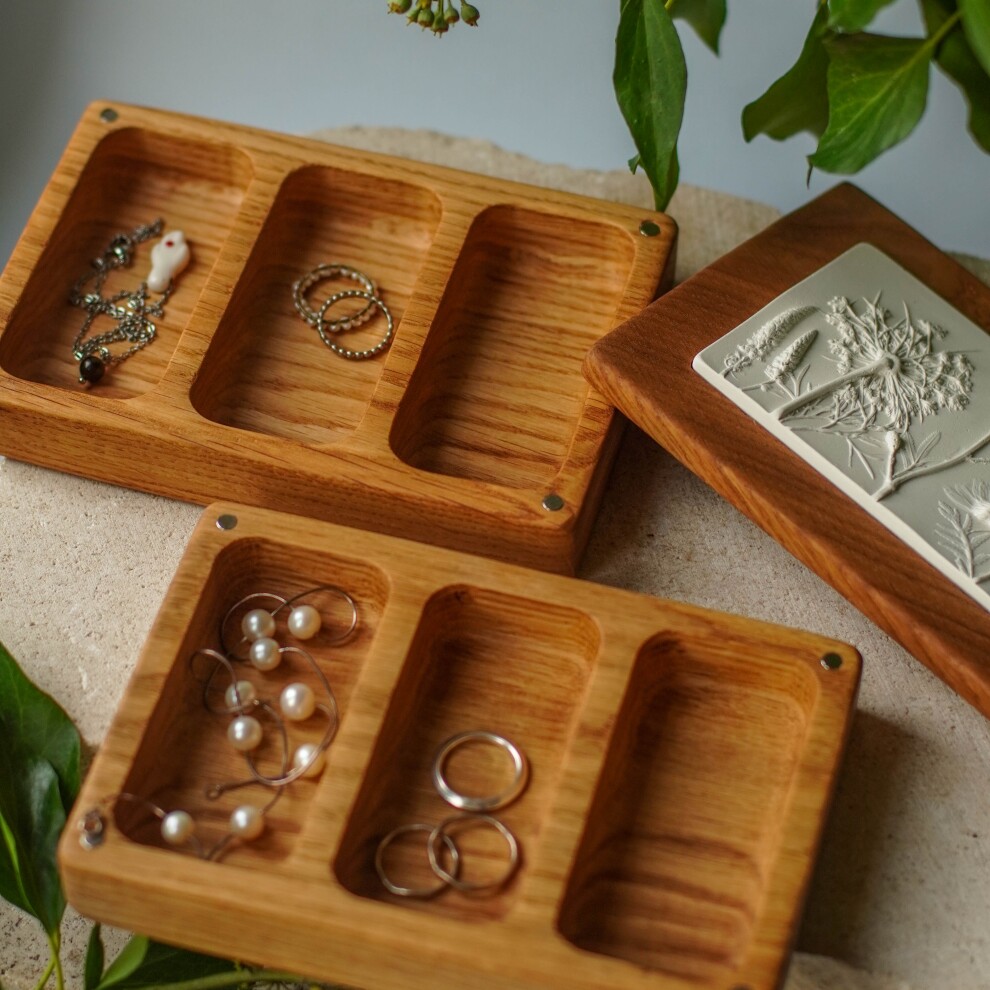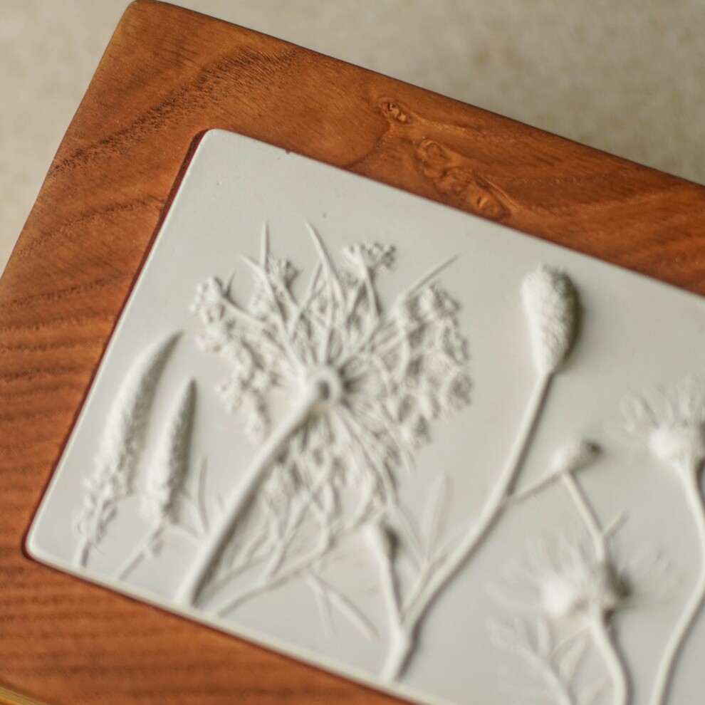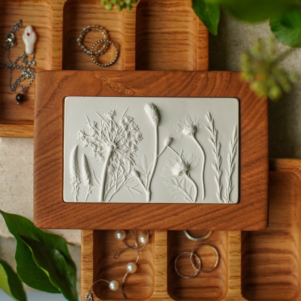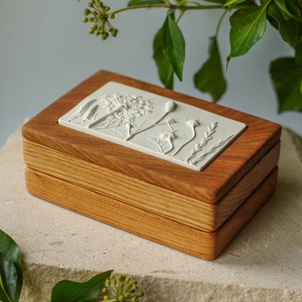 Шкатулка для украшений выполнена из массива дуба, дерево покрыто маслом. Барельеф - гипсовый оттиск натуральных растений.