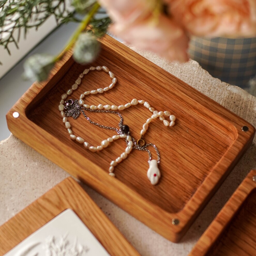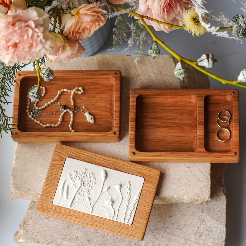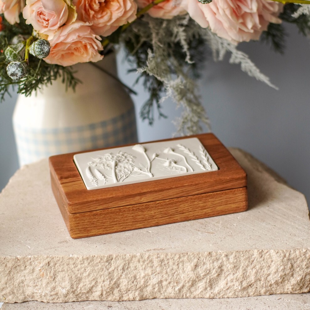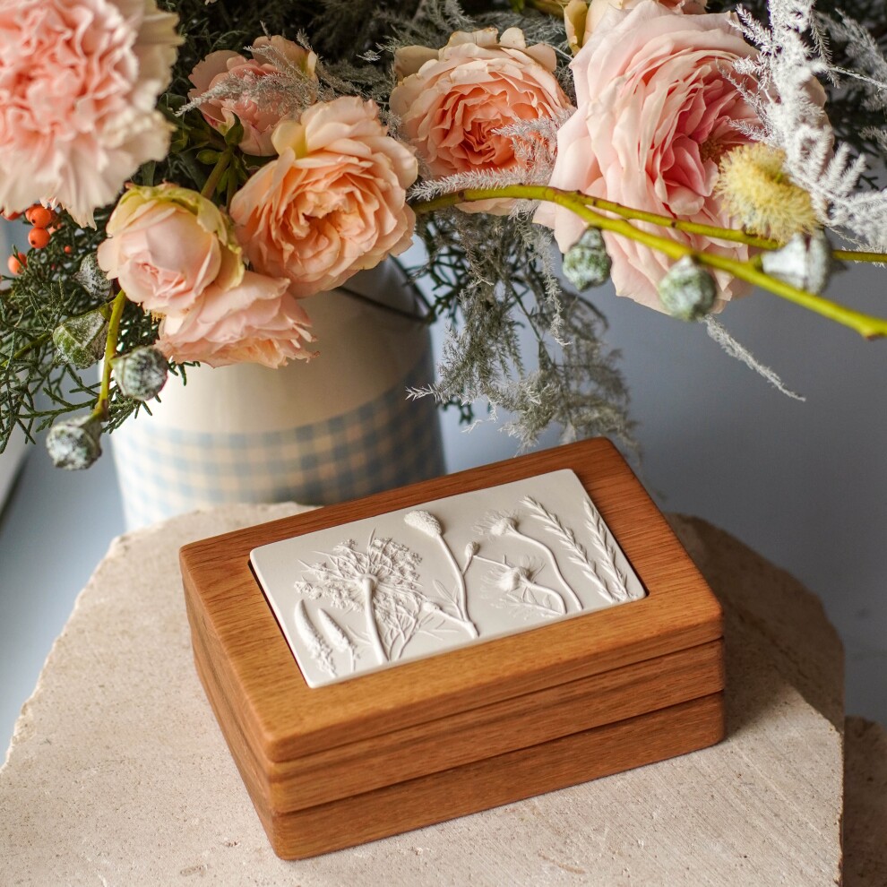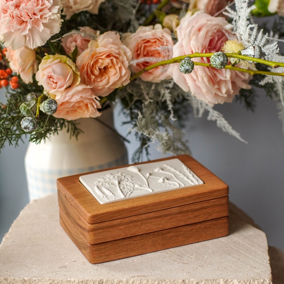 Шкатулка для украшений выполнена из массива дуба, дерево покрыто маслом. Цвет и узор дерева могут отличаться от представленных на фото. Барельеф - гипсовый оттиск натуральных растений.