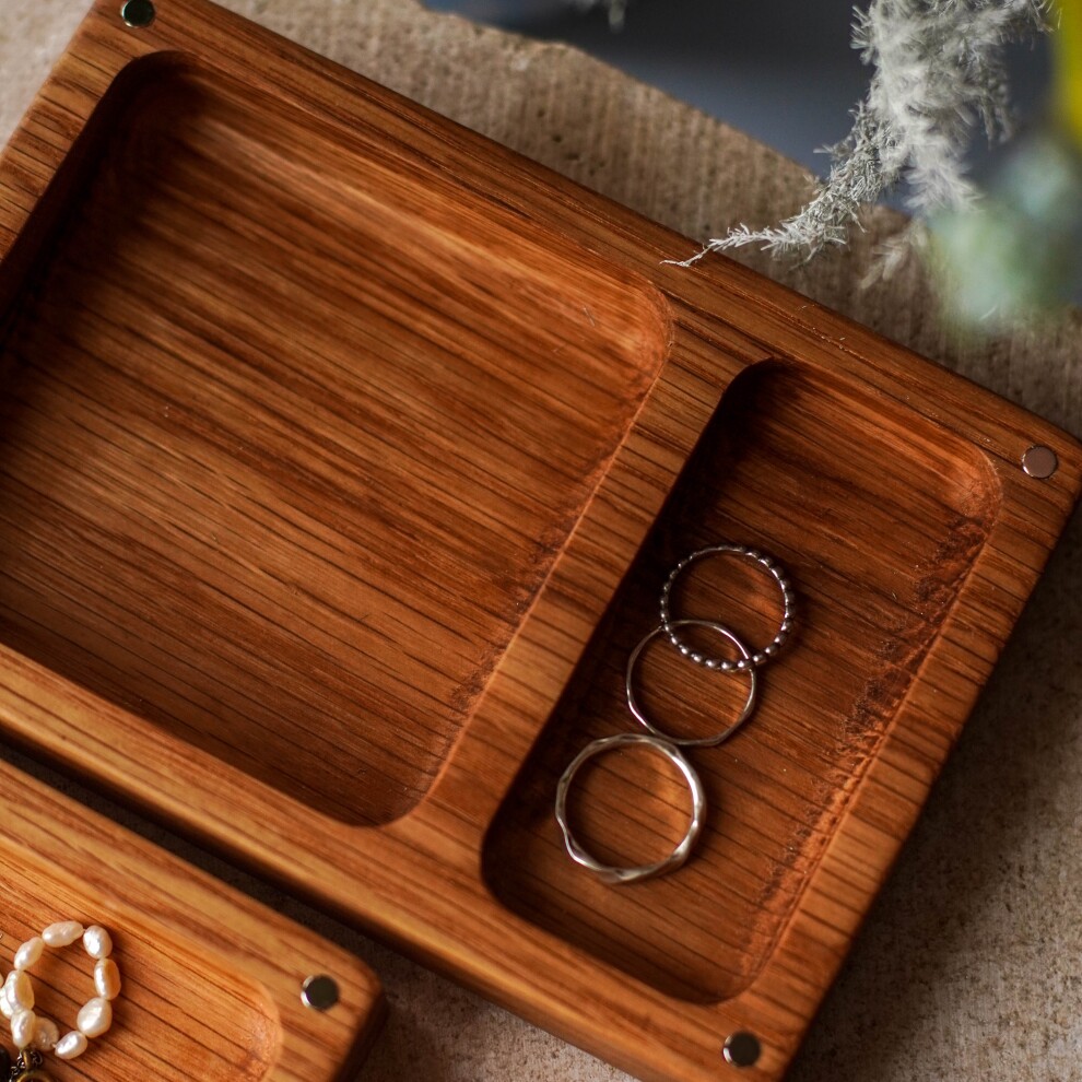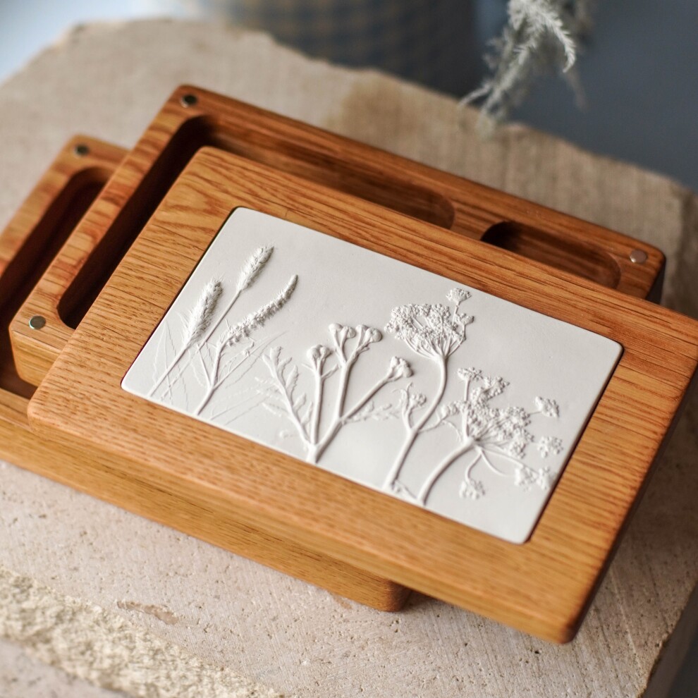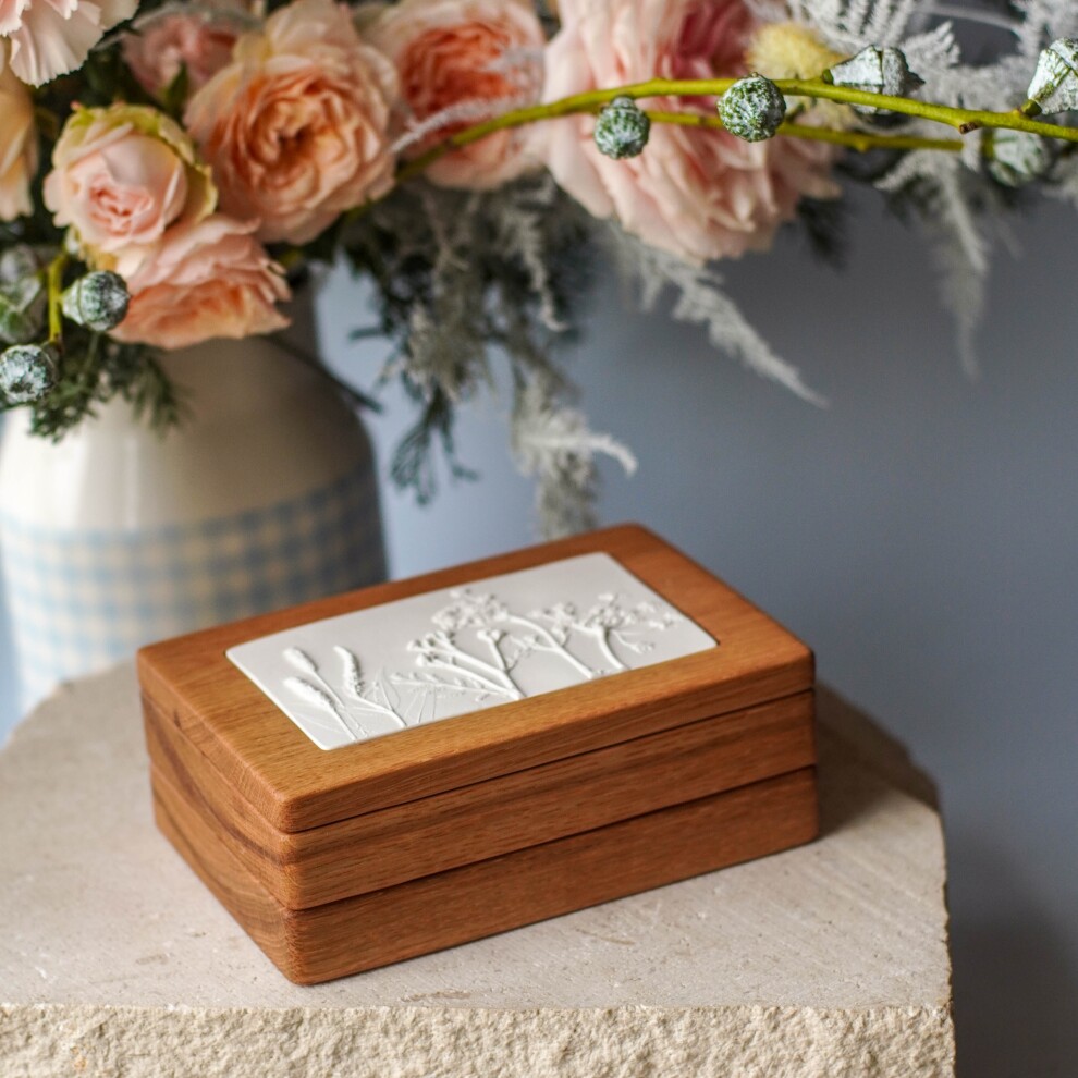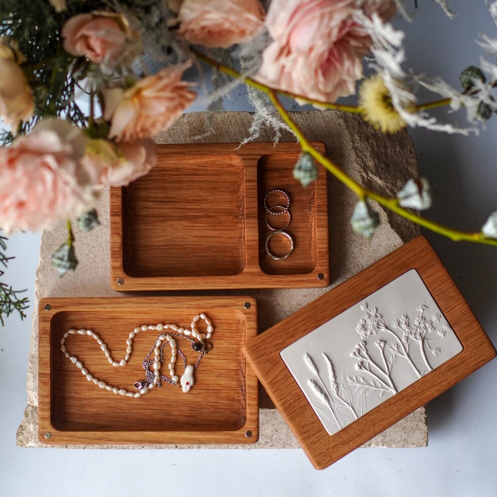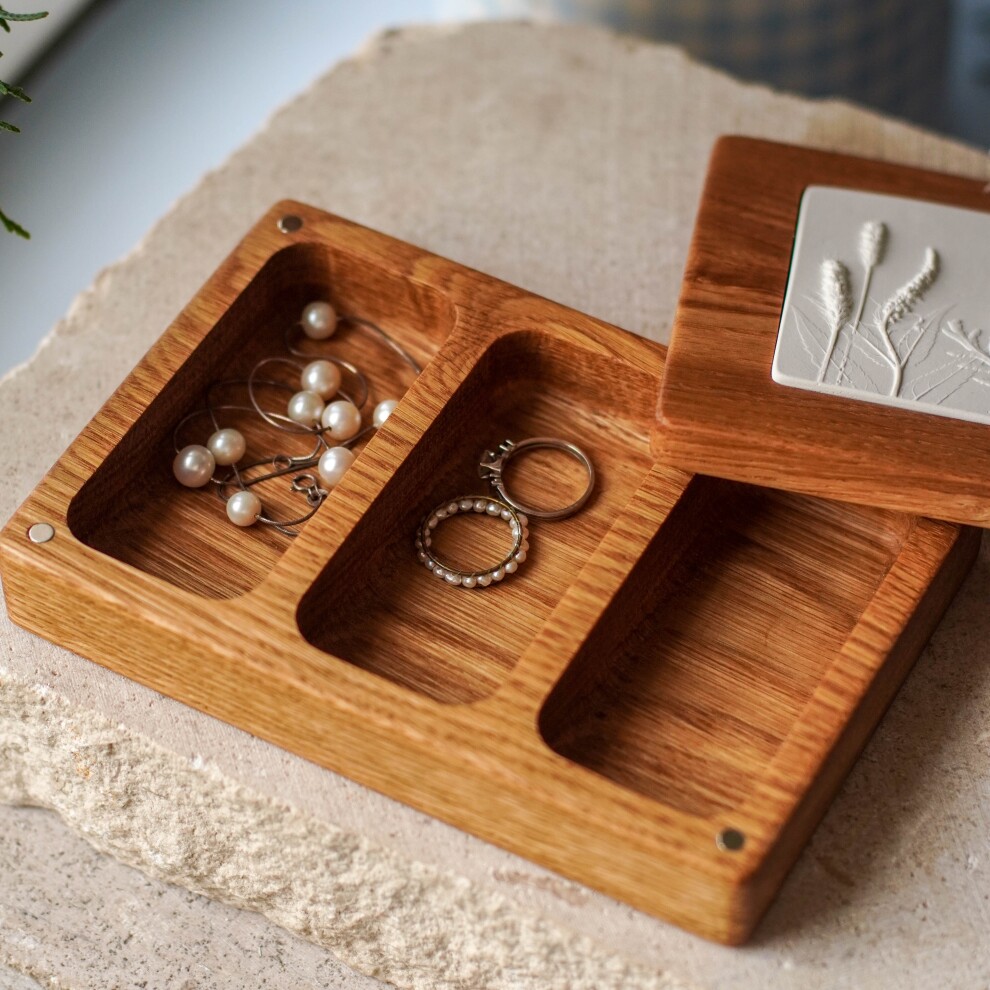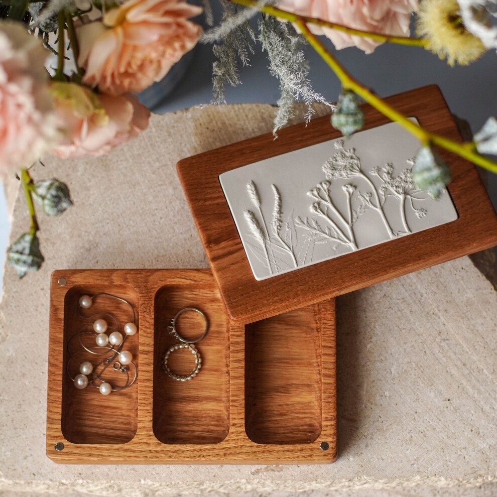 Шкатулка для украшений выполнена из массива дуба, дерево покрыто маслом. Цвет и узор дерева могут отличаться от представленных на фото. Барельеф - гипсовый оттиск натуральных растений.