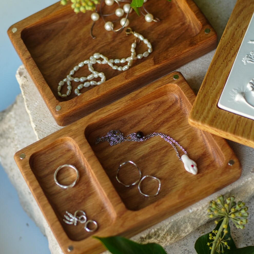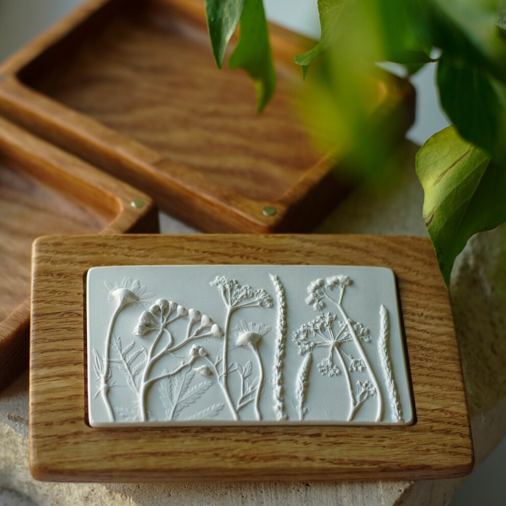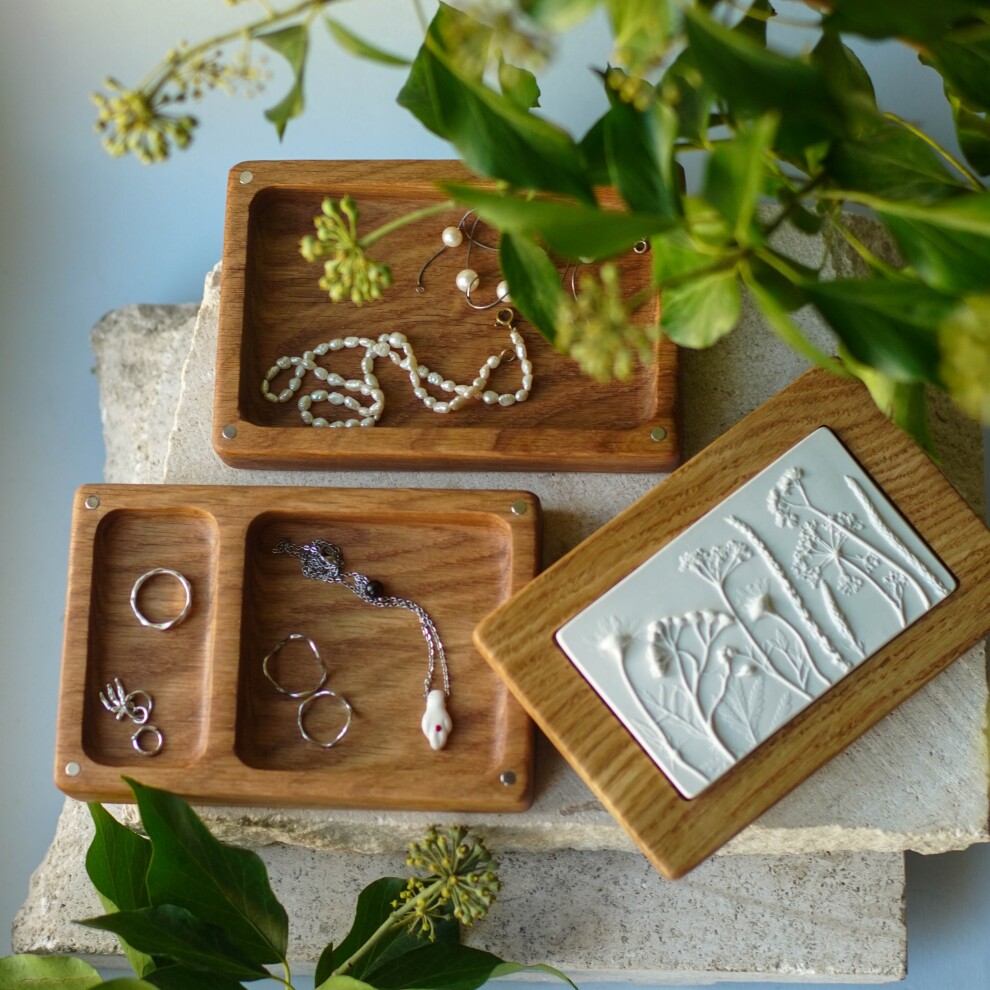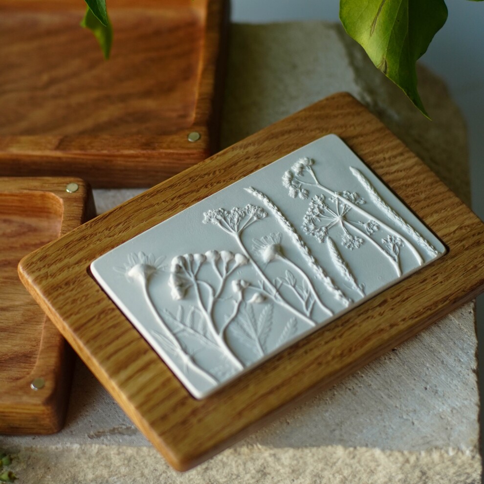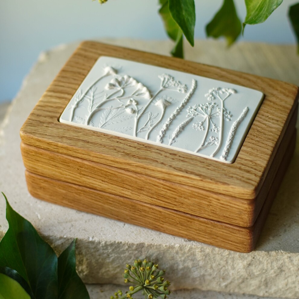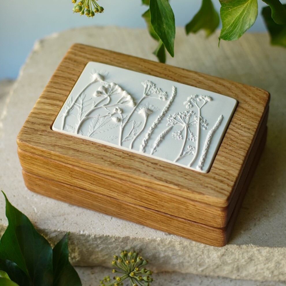 Шкатулка для украшений выполнена из массива дуба, дерево покрыто маслом. Барельеф - гипсовый оттиск натуральных растений.