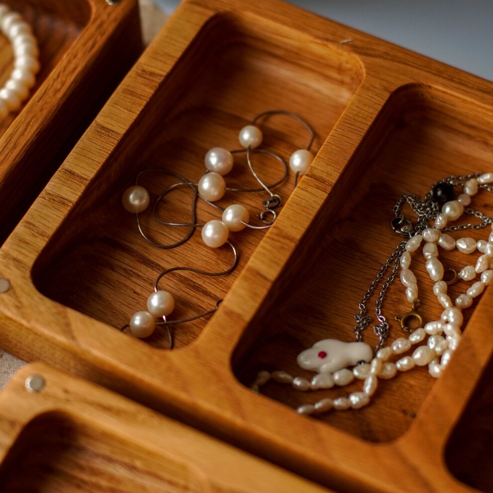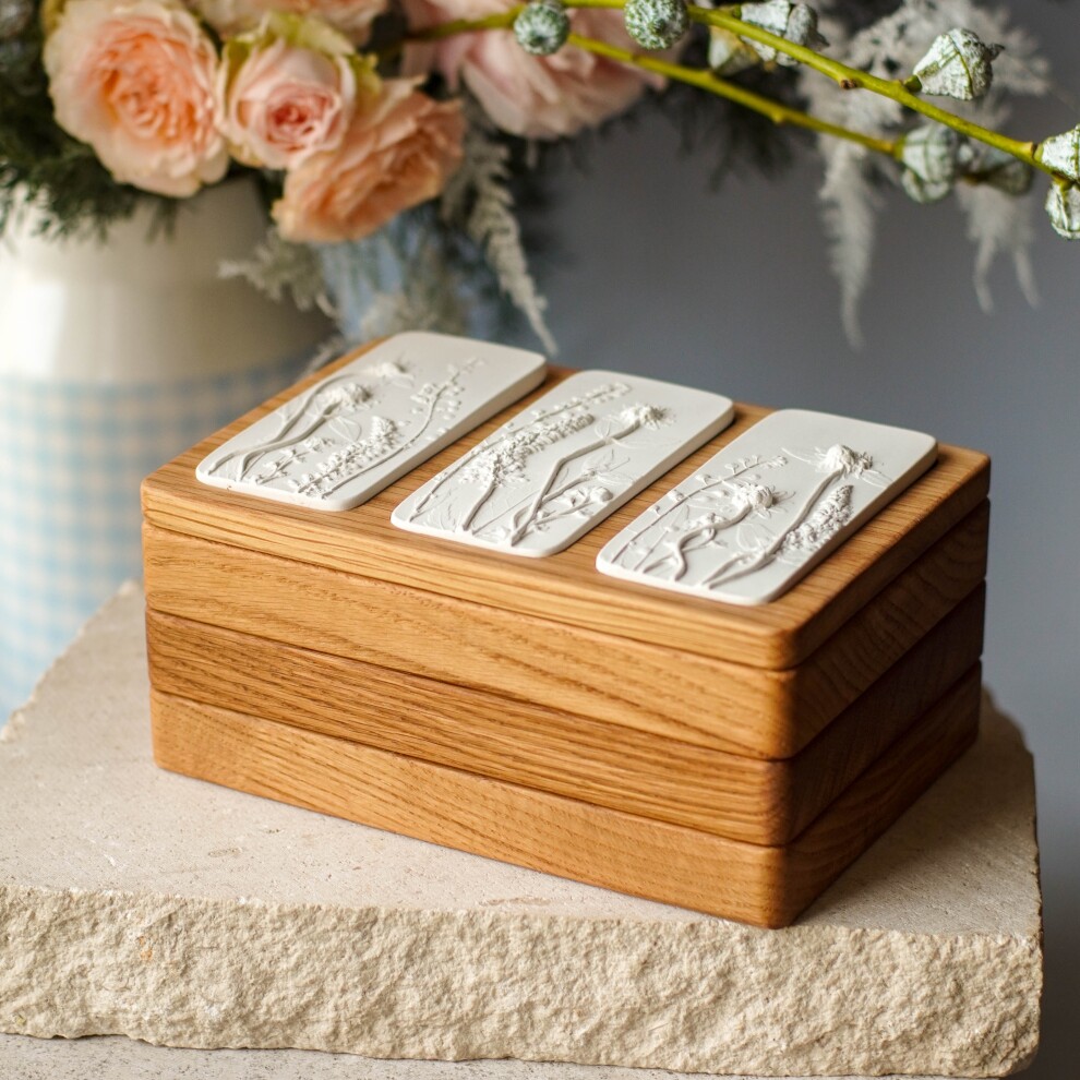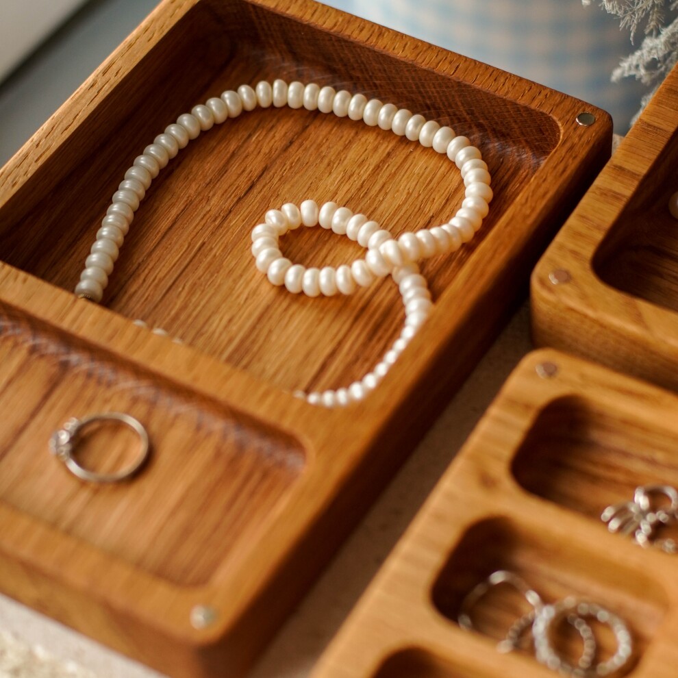 Шкатулка для украшений выполнена из массива дуба, дерево покрыто прозрачным гипоаллергенным маслом. Цвет и узор дерева могут отличаться от представленных на фото.